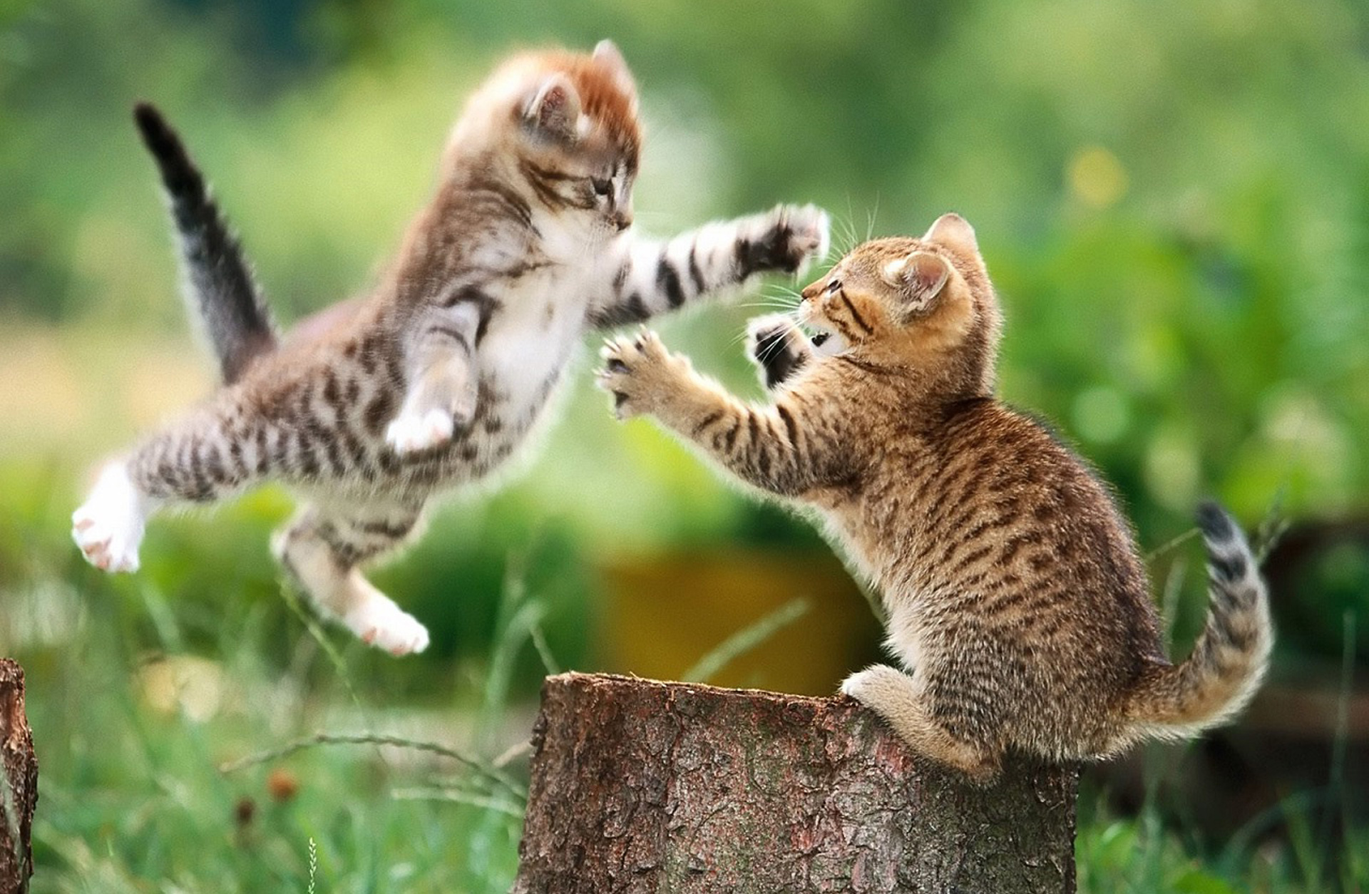 Description: Two kittens playing with each other on a tree stump in a field of grass and trees in the background.