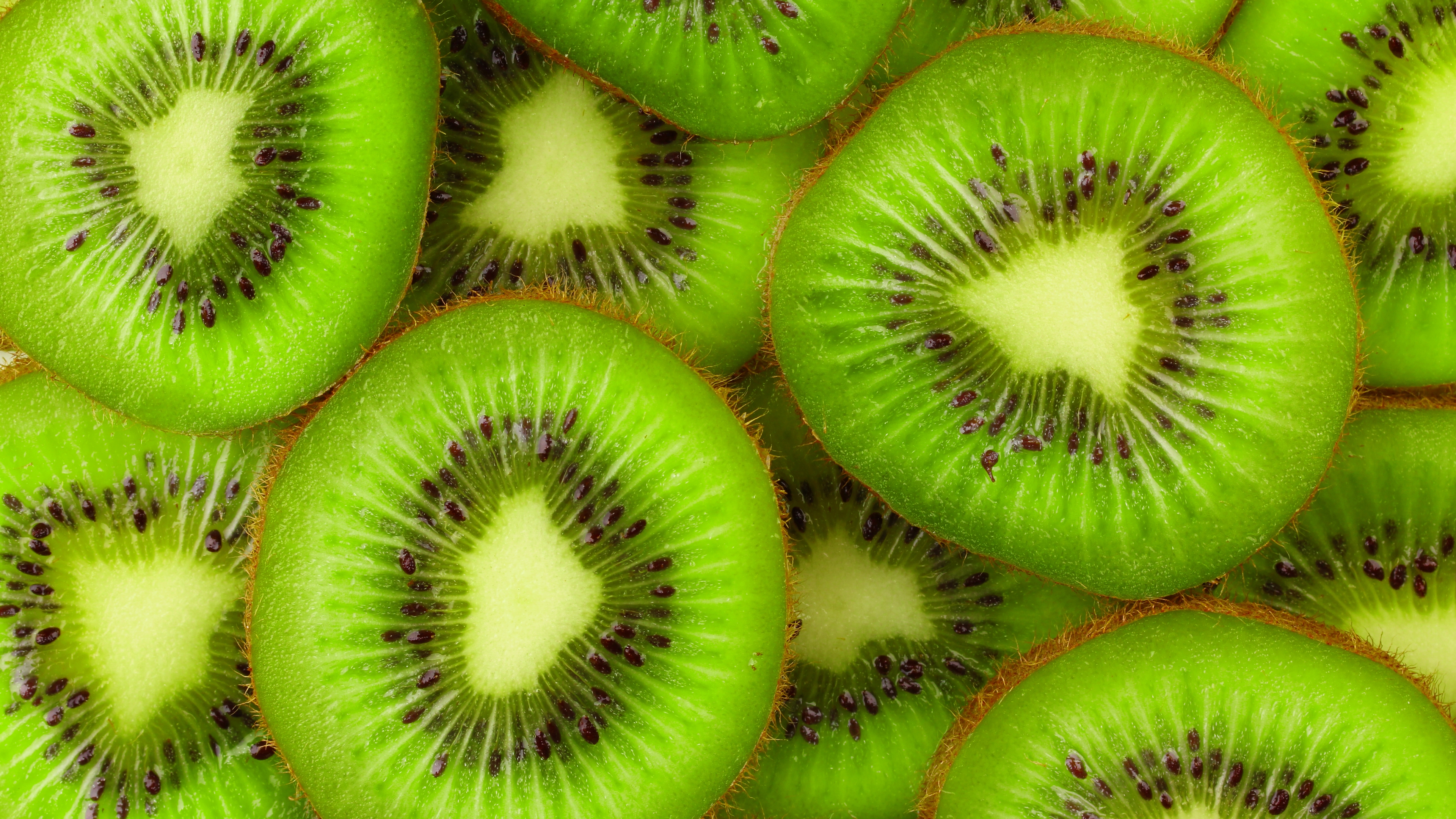 Description: A close up of a kiwi fruit sliced in half and arranged in a pattern on a white surface.