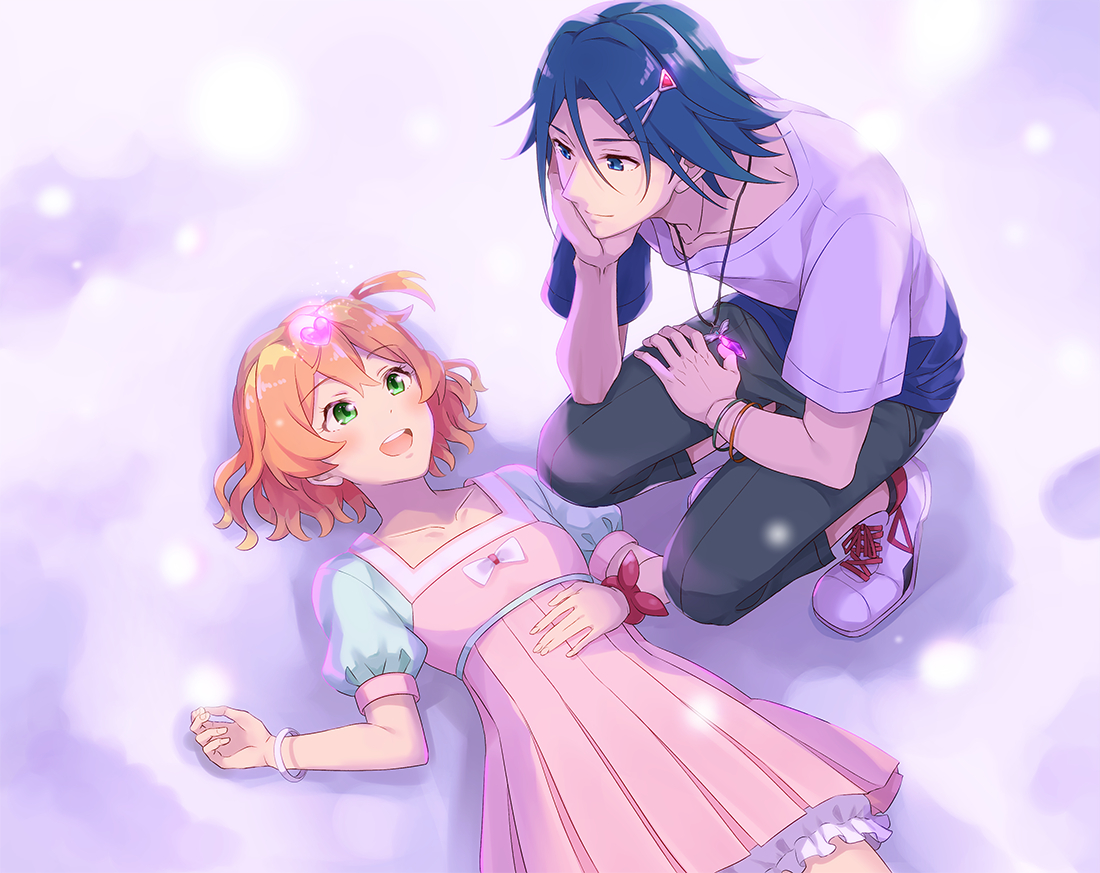Description: A man kneeling next to a little girl on a bed in the snow with a pink dress on and a purple background.