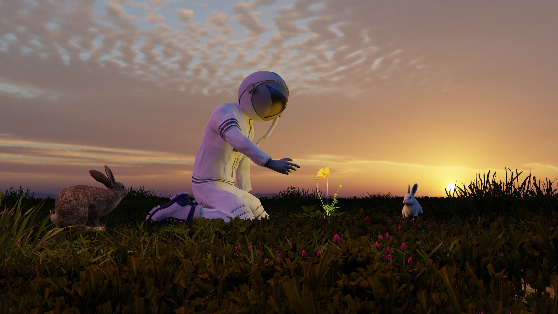 Description: A person kneeling in a field with a flower in their hand and a bunny in the grass behind them.
