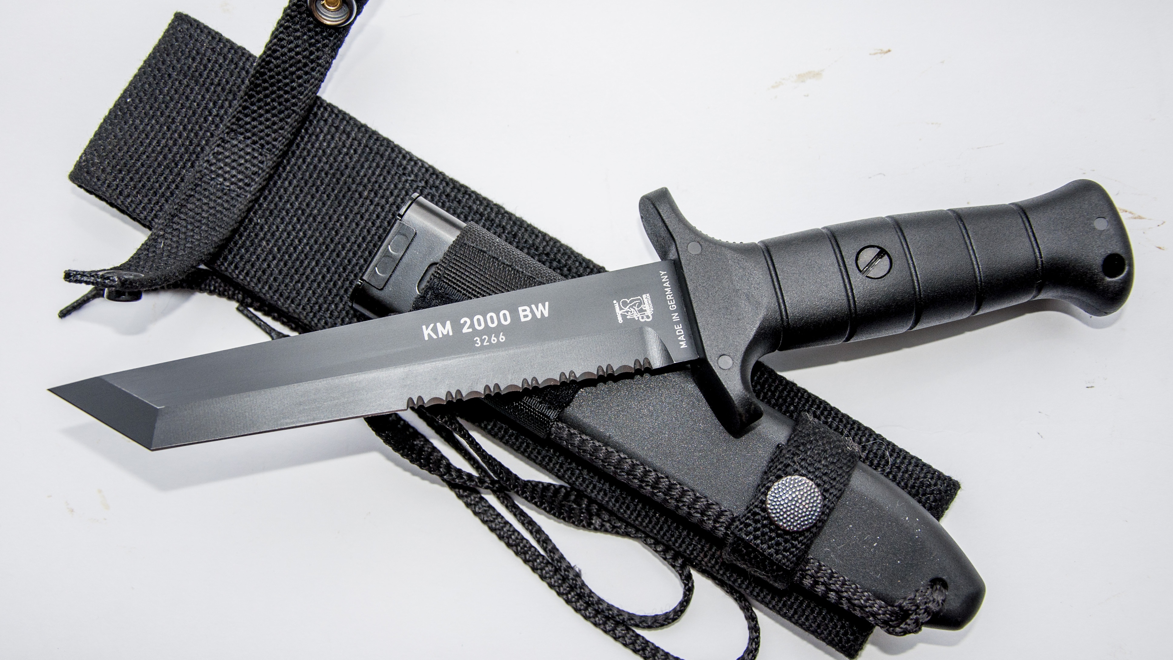 Description: A knife with a black handle and a black sheath on it's side on a white surface with a black strap.