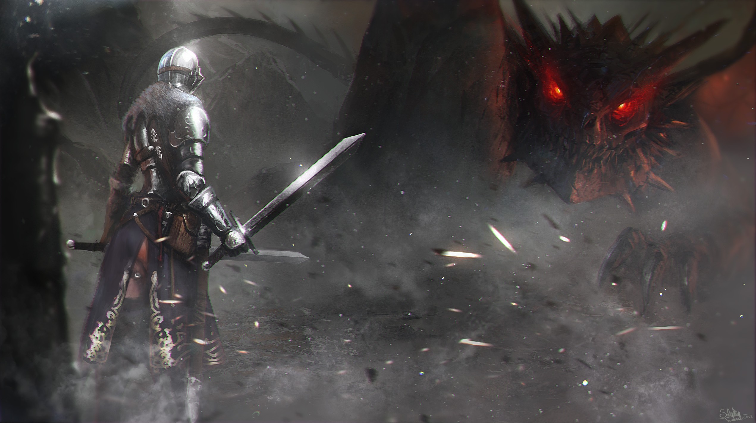 Description: A knight standing next to a demon in a dark forest with a sword in his hand and a demon in the background.