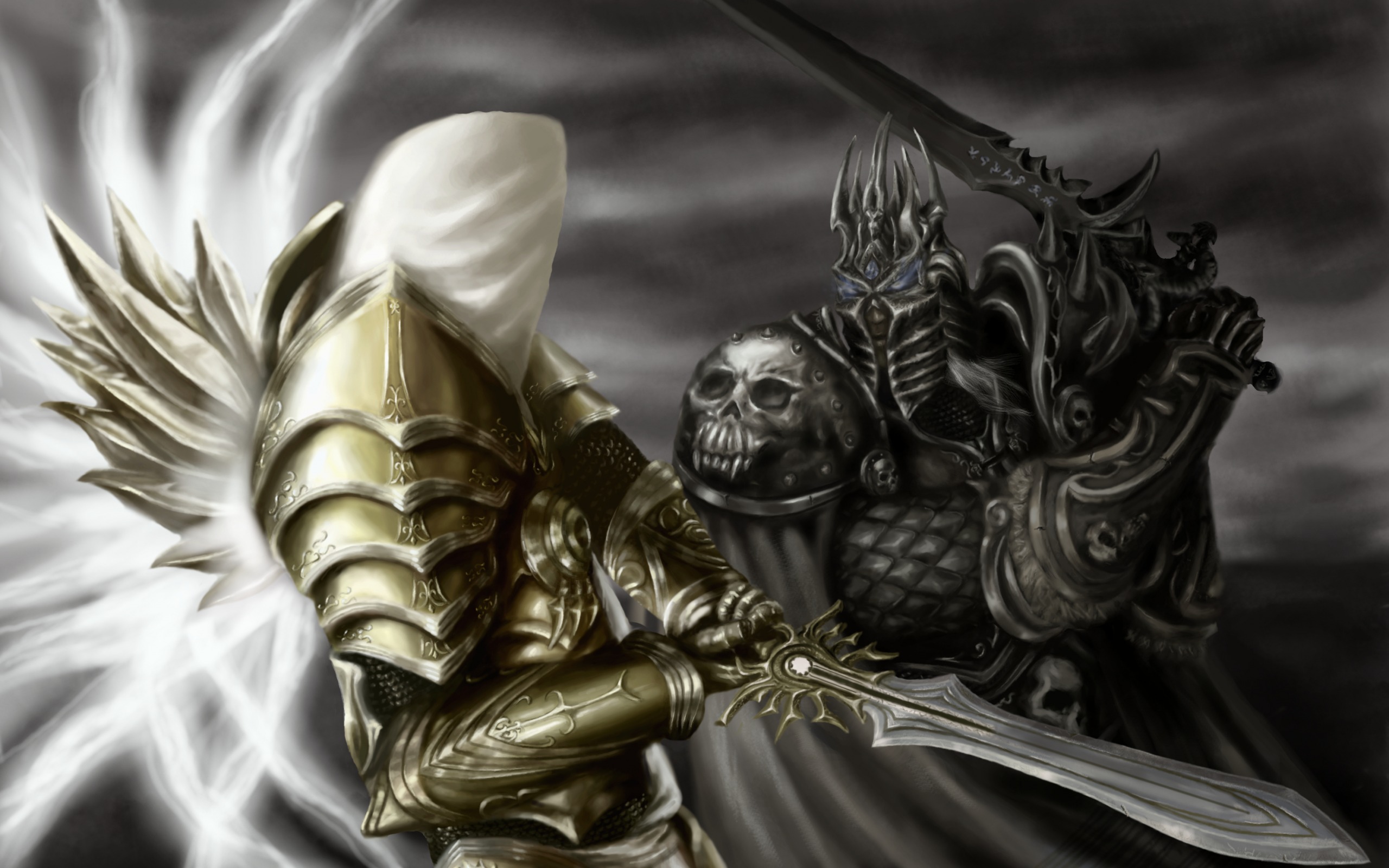 Description: A painting of a knight and a demon holding swords in their hands with a skull on the other side.