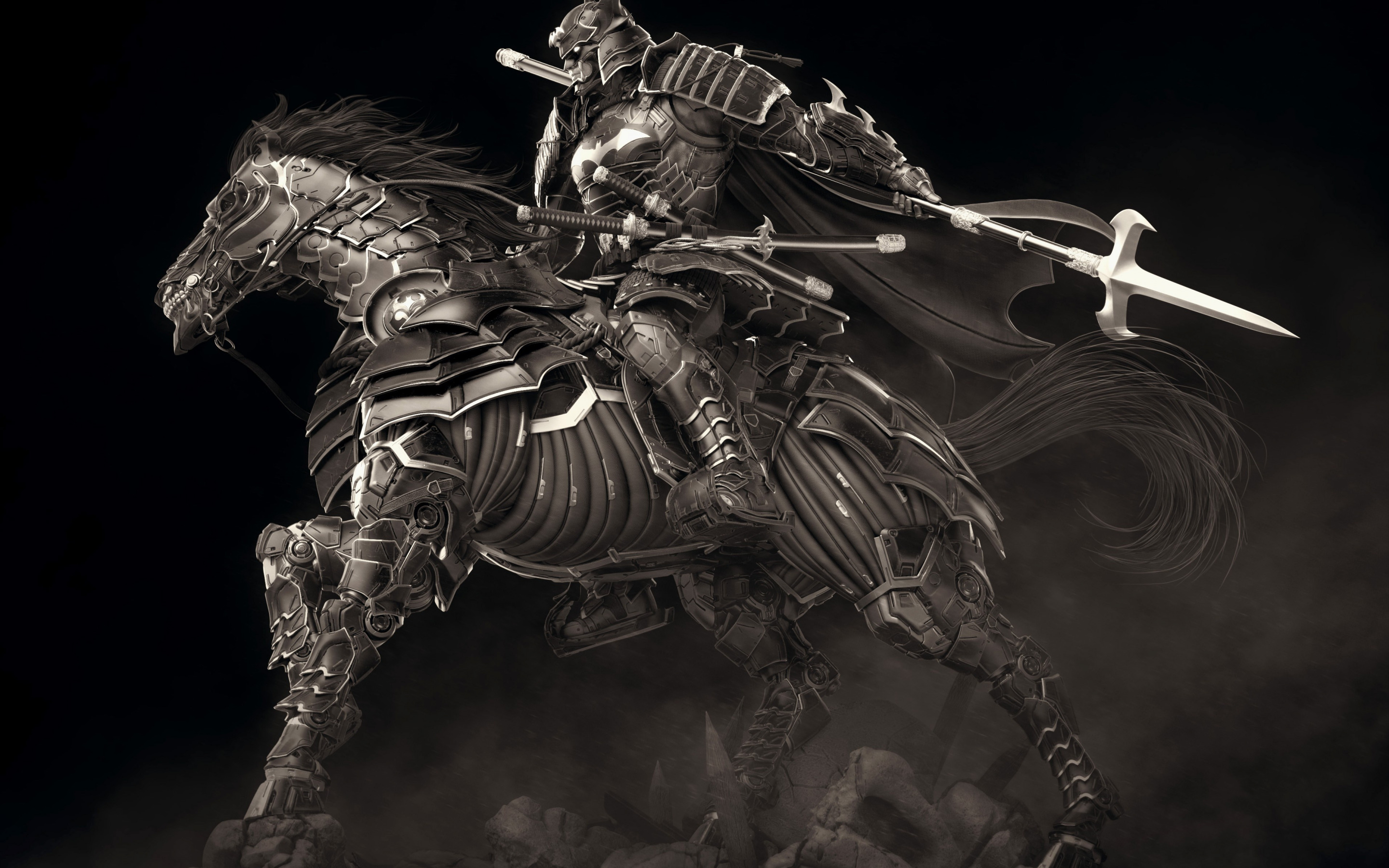 Description: A knight on a horse with a sword in his hand and a sword in his other hand.