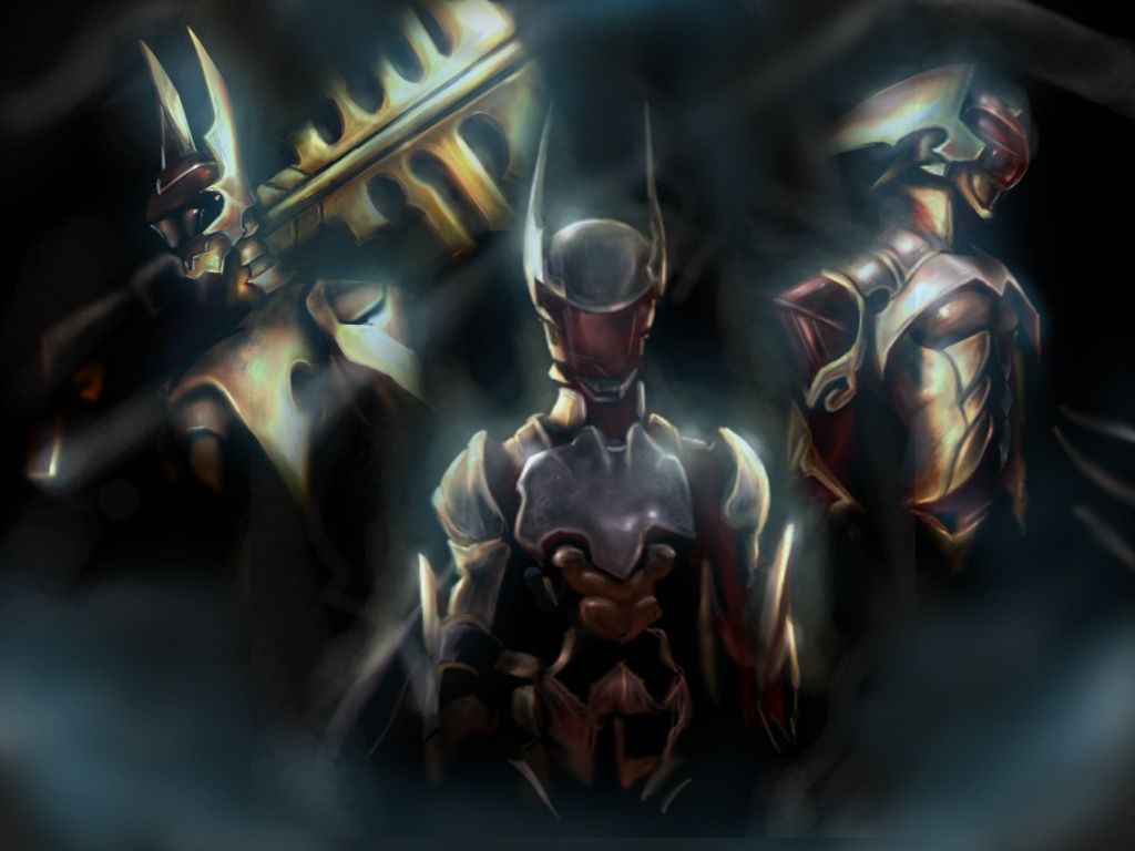 Description: A group of knights standing next to each other in front of a mirror with a black background and a blue light.
