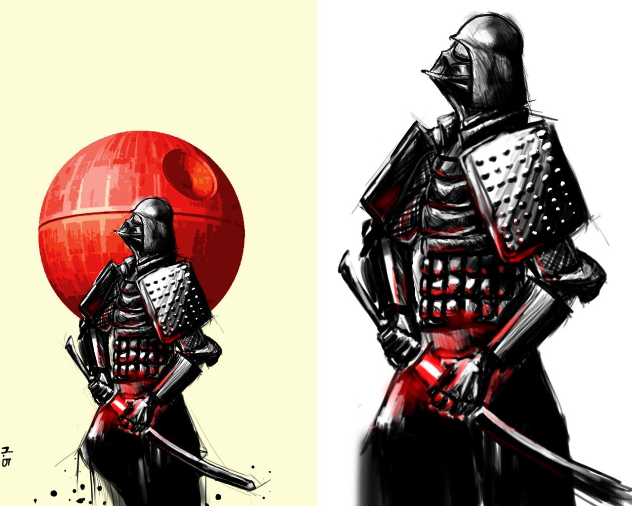 Description: A couple of knights standing next to each other in front of a red ball and a black and white drawing of a knight.