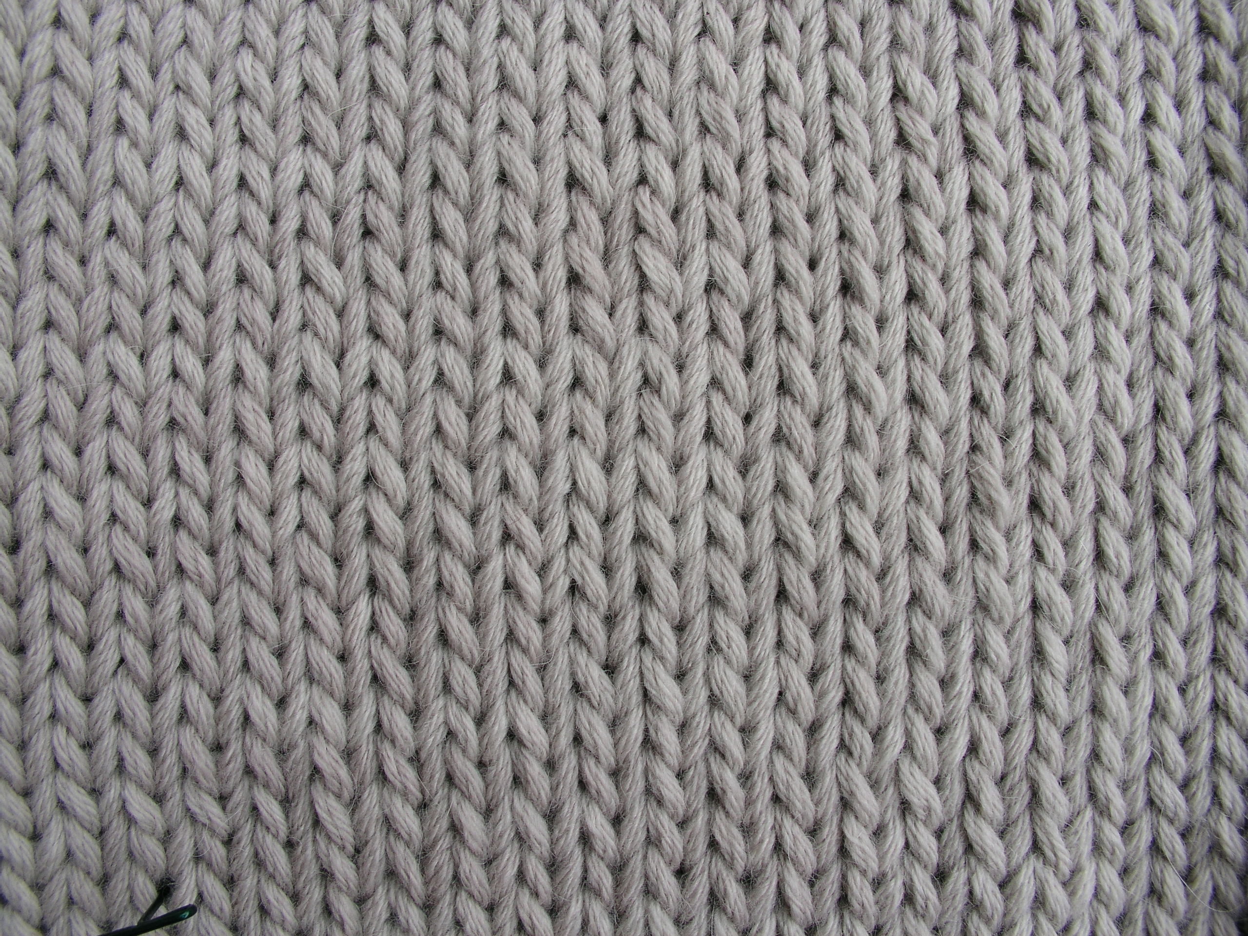 Description: A close up of a knitted cloth with a black stitch on it and a black object in the middle.