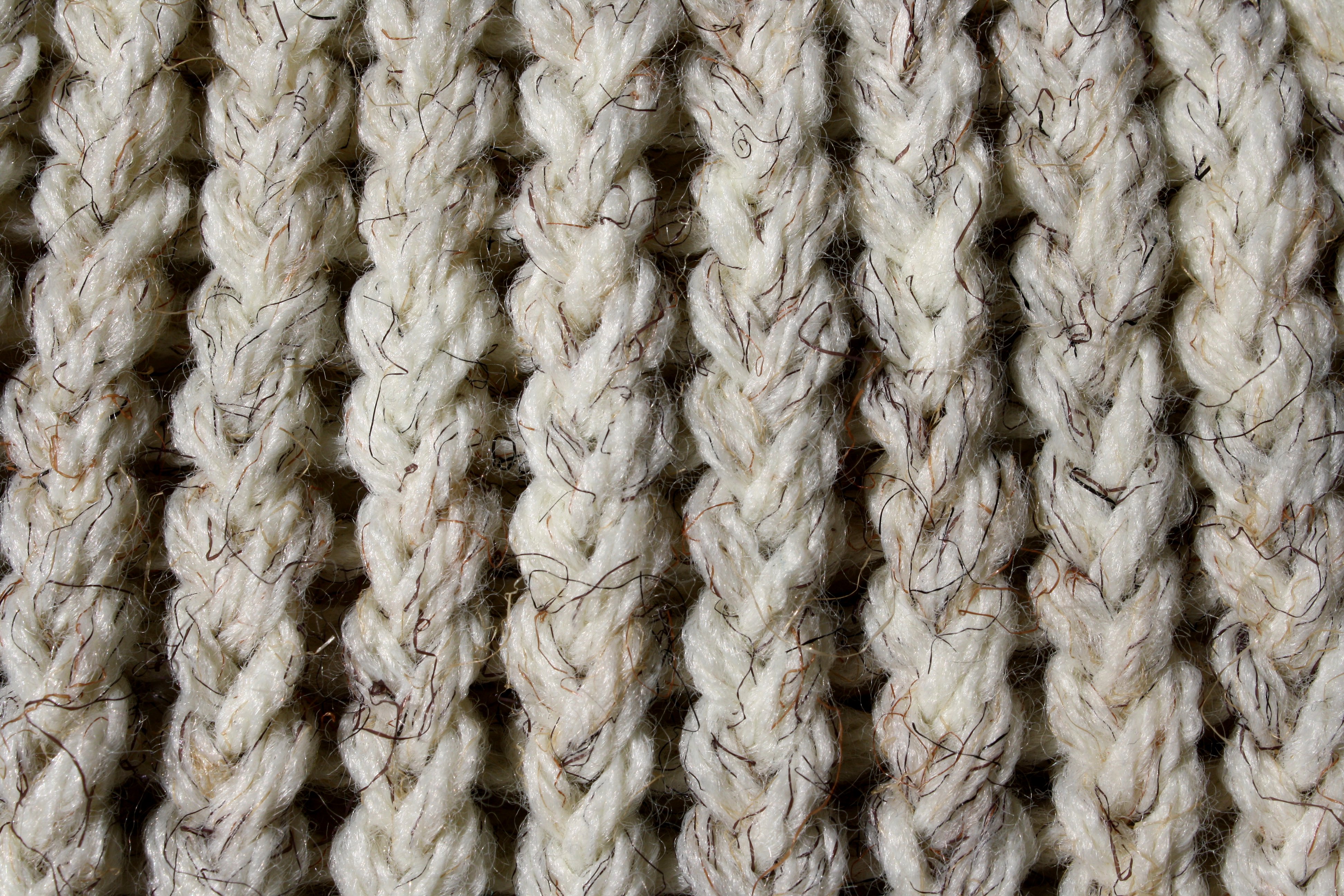 Description: A close up of a white knitted material with brown thread on it's edges and a black hook.