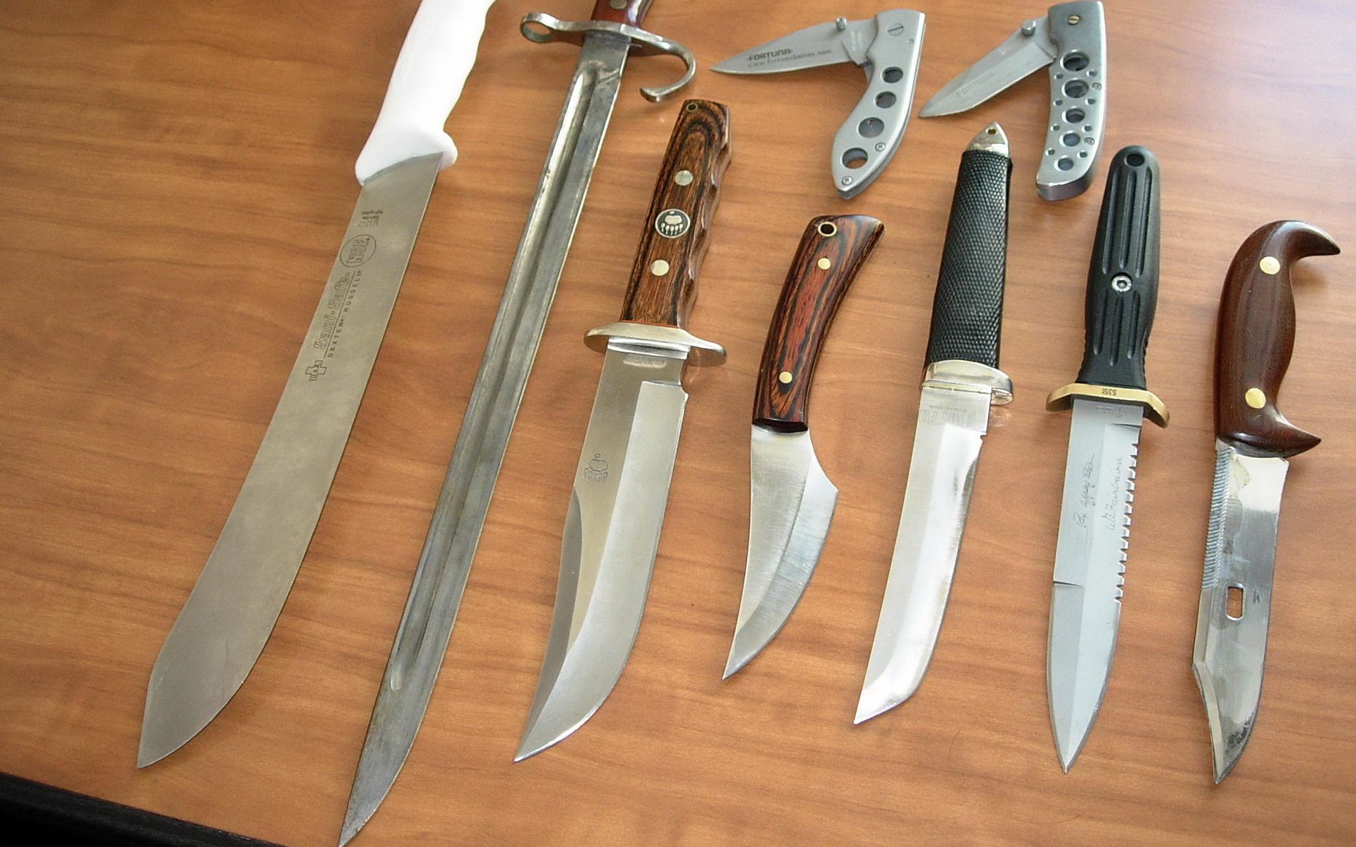Description: A collection of knives are lined up on a table top with knives in them and a knife sharpener.