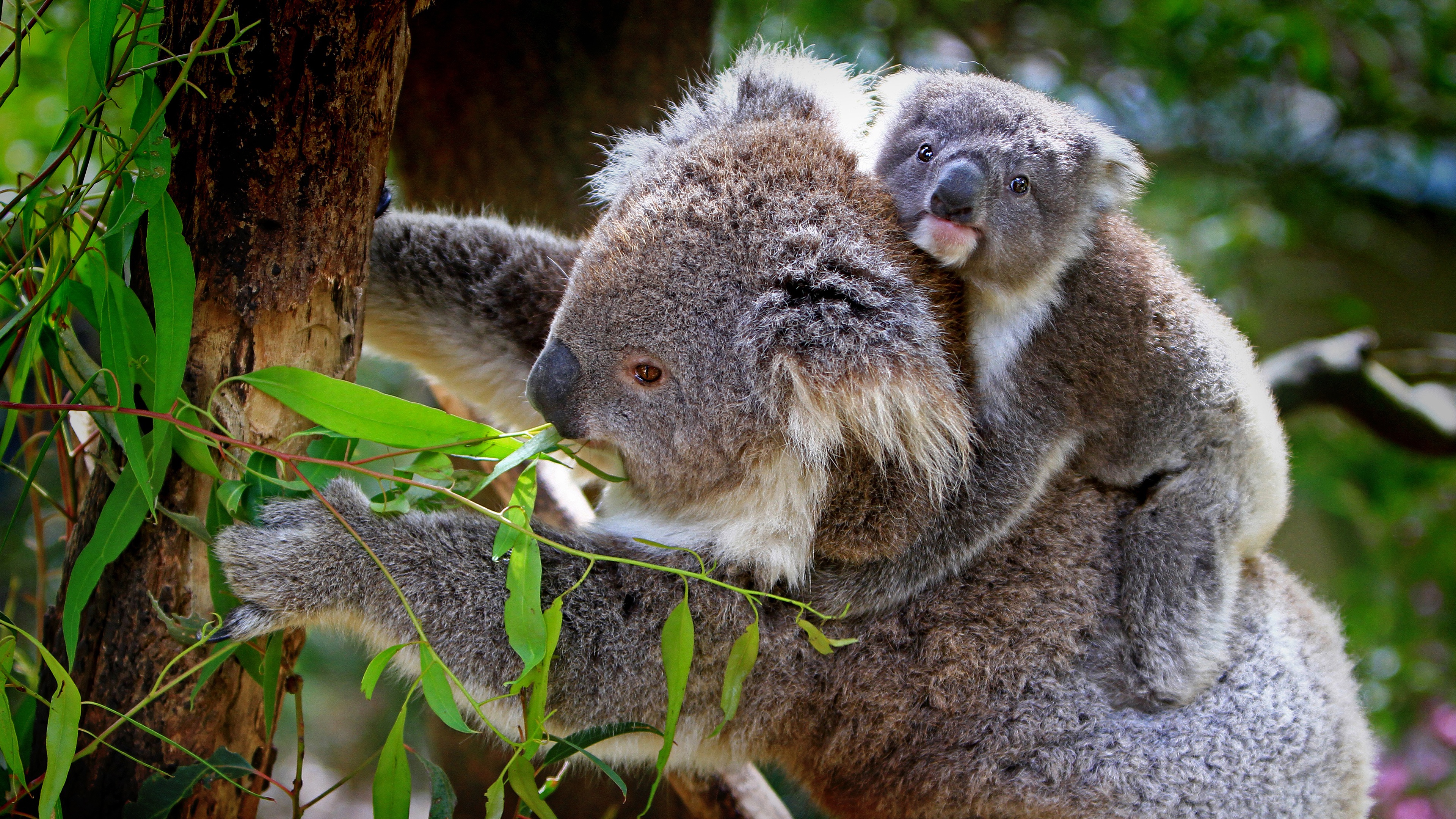 Description: A koala bear is holding onto a tree branch with its head on another koala bear's shoulder.