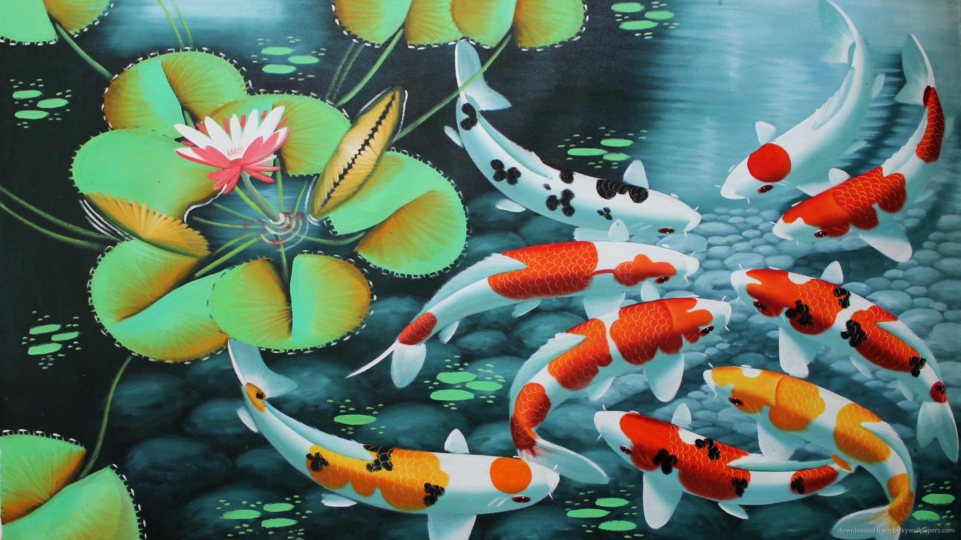 Description: A painting of koi fish in a pond with lily pads and a pink flower in the center of the painting.