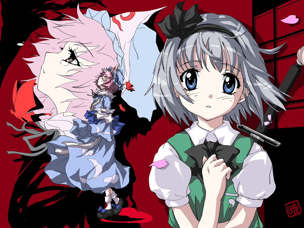 Description: Two anime characters standing next to each other in a room with red walls and a red floor and a red wall.