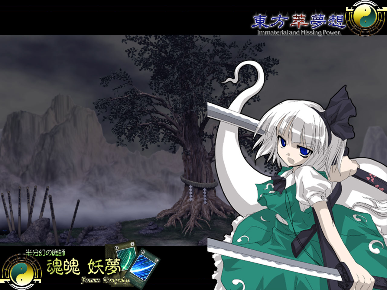 Description: A anime character holding a sword in front of a mountain landscape with a full moon in the background and a full moon in the foreground.