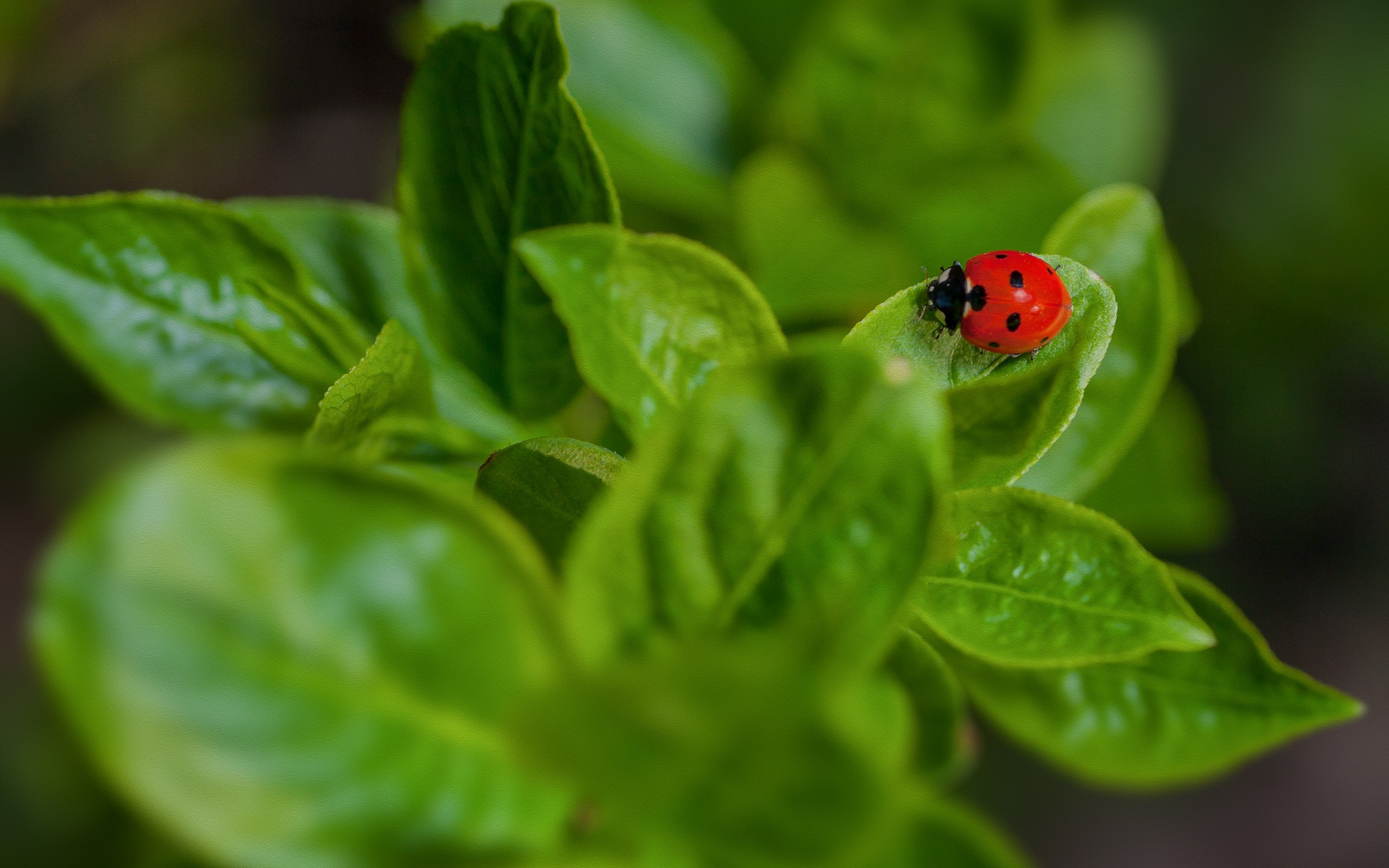 Description: A lady bug sitting on top of a green leafy plant with leaves around it and a red spot on the back of the bug.