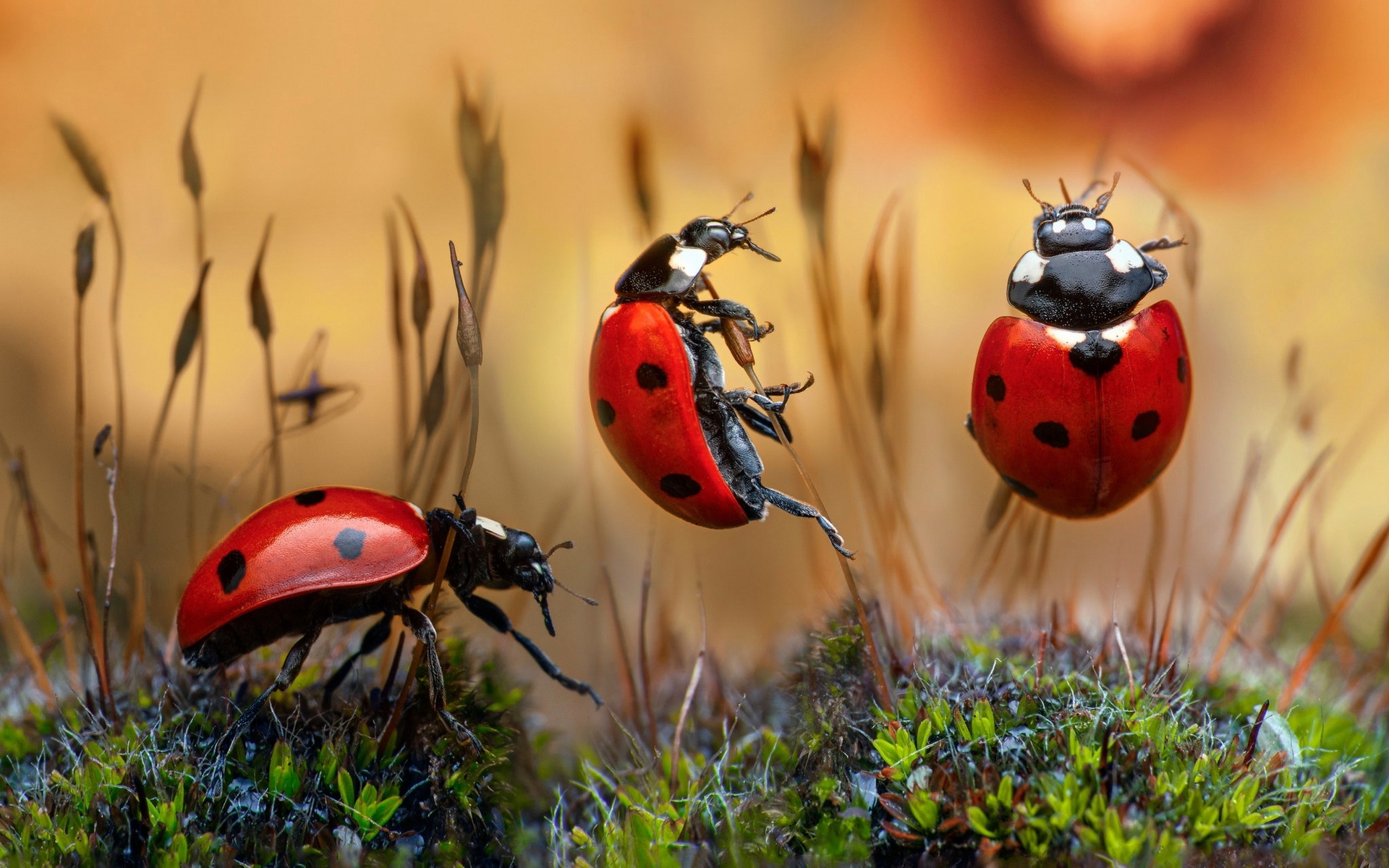 Description: A group of ladybugs sitting on top of a moss covered ground next to each other on top of a plant.