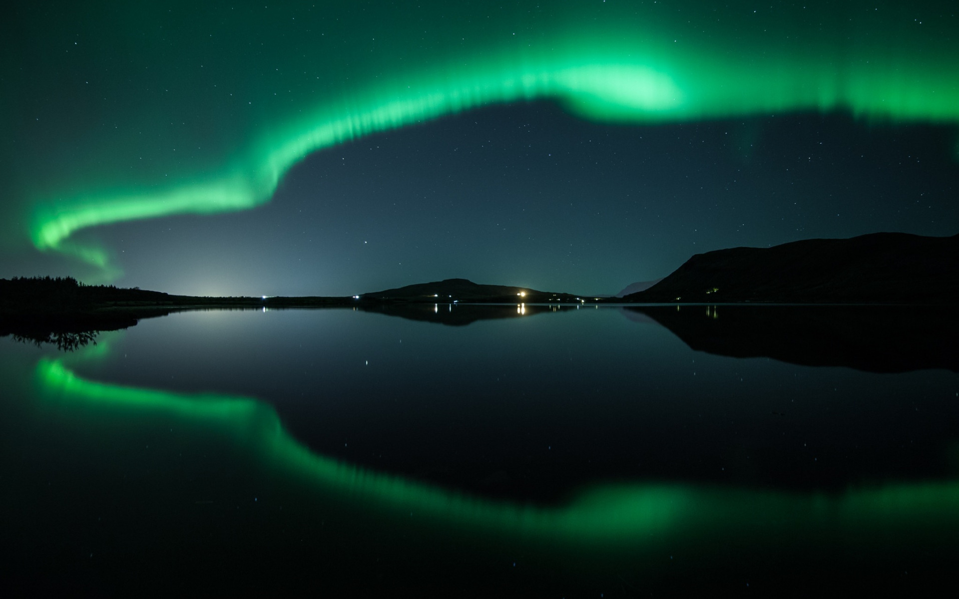 Description: A lake with a green aurora bore in the sky above it and a mountain in the background with a reflection in the water.