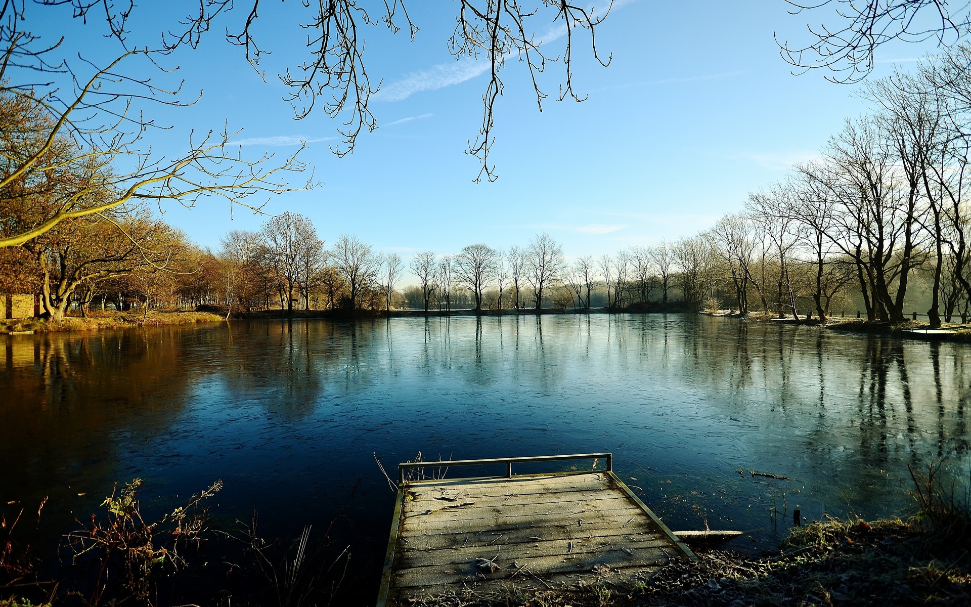 Description: A dock on a lake surrounded by trees and water with no leaves on it and a blue sky with wispy clouds.