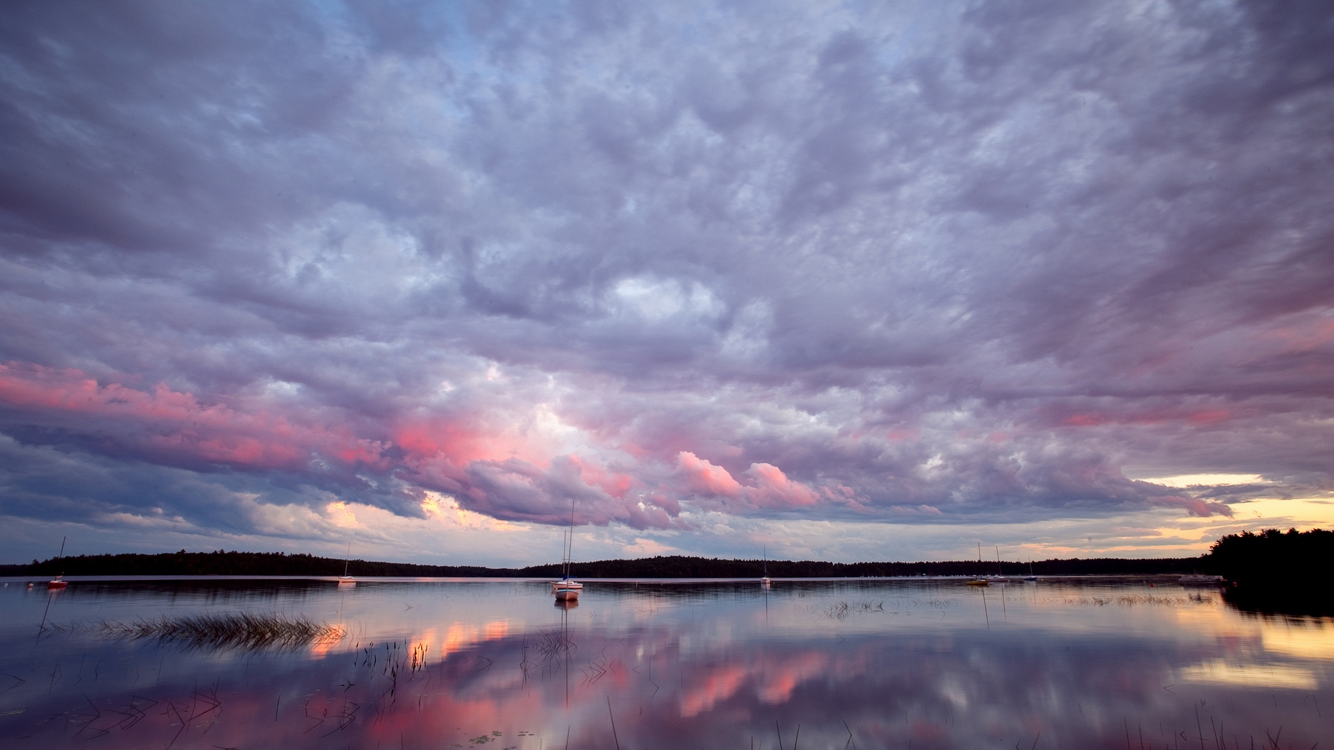 Description: A lake with a boat in it and a sky filled with clouds above it and a few boats in the water.