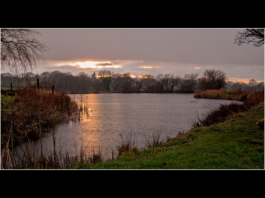 Description: A lake with a boat in it and a sunset in the background with clouds in the sky and trees in the foreground.