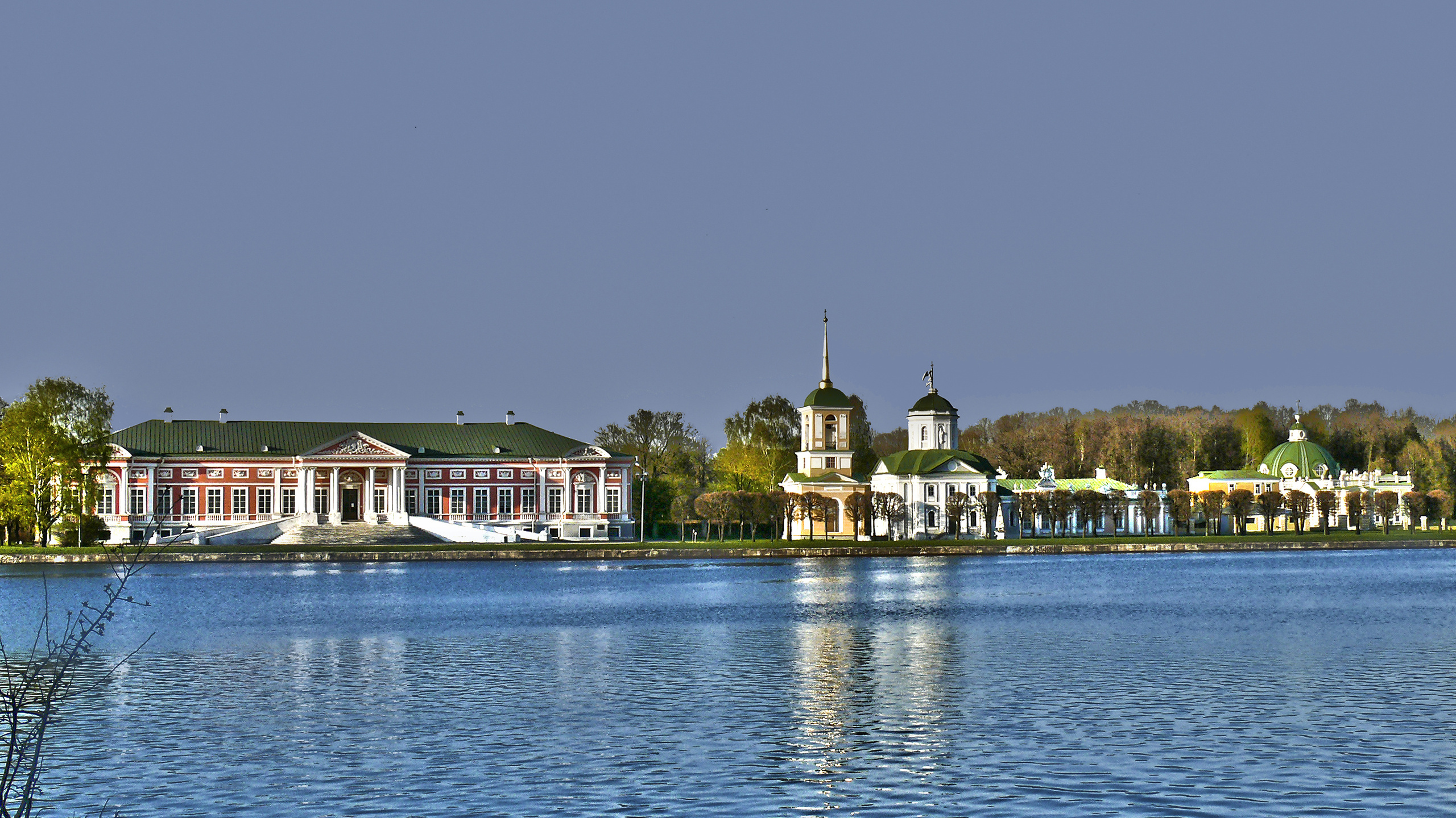 Description: A lake with a building in the background and a clock tower in the foreground of the photo.