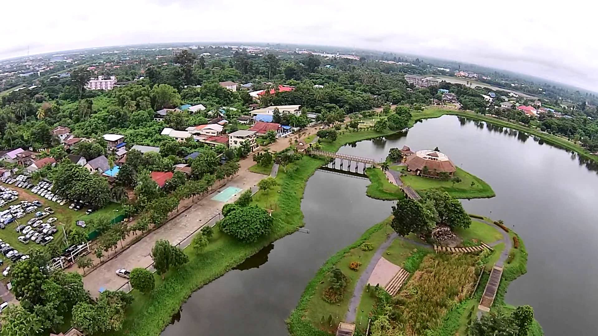 Description: A bird's eye view of a lake and a city with a bridge in the middle of it.