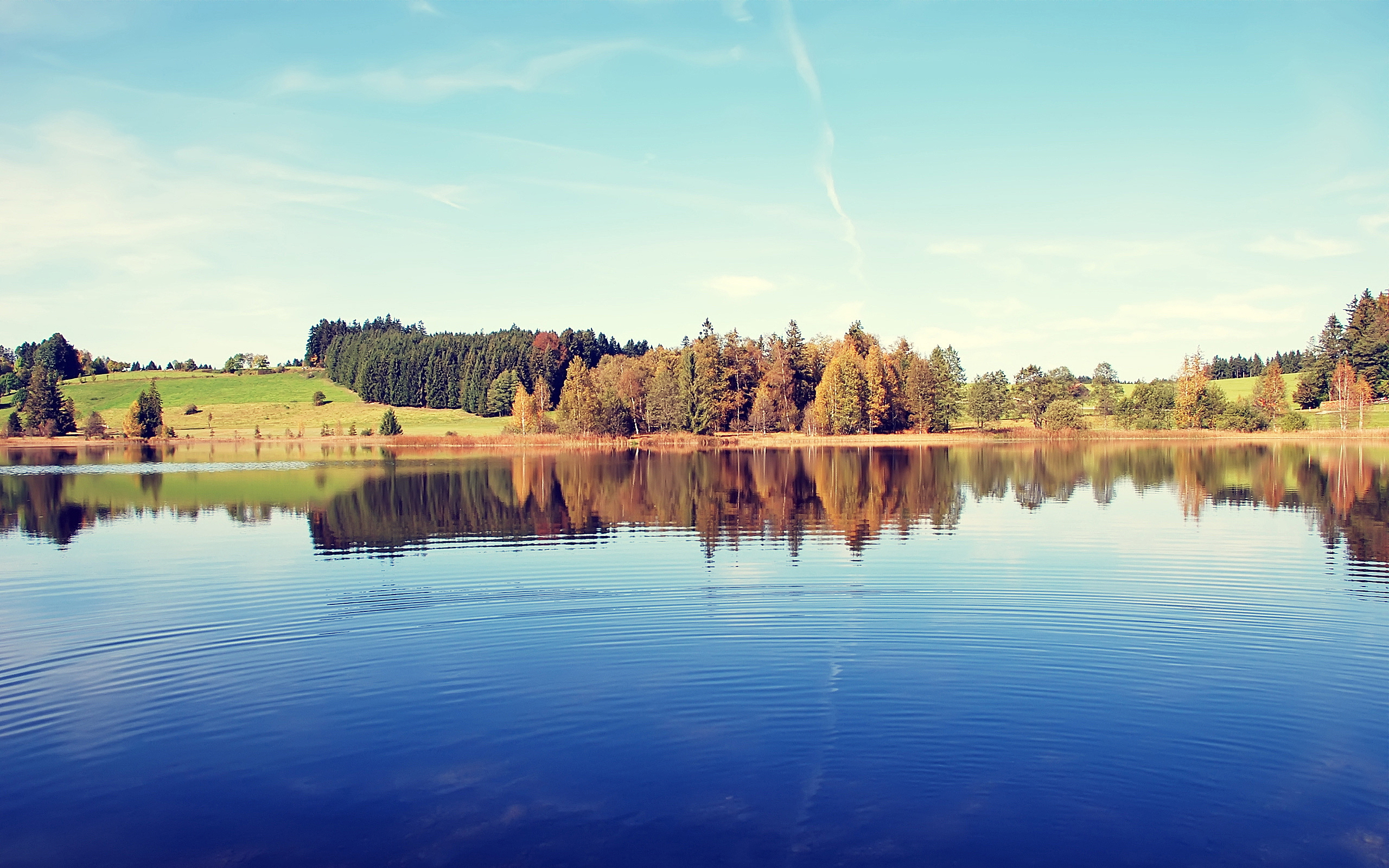 Description: A lake with a few trees in the background and a blue sky above it with a few clouds in the sky.