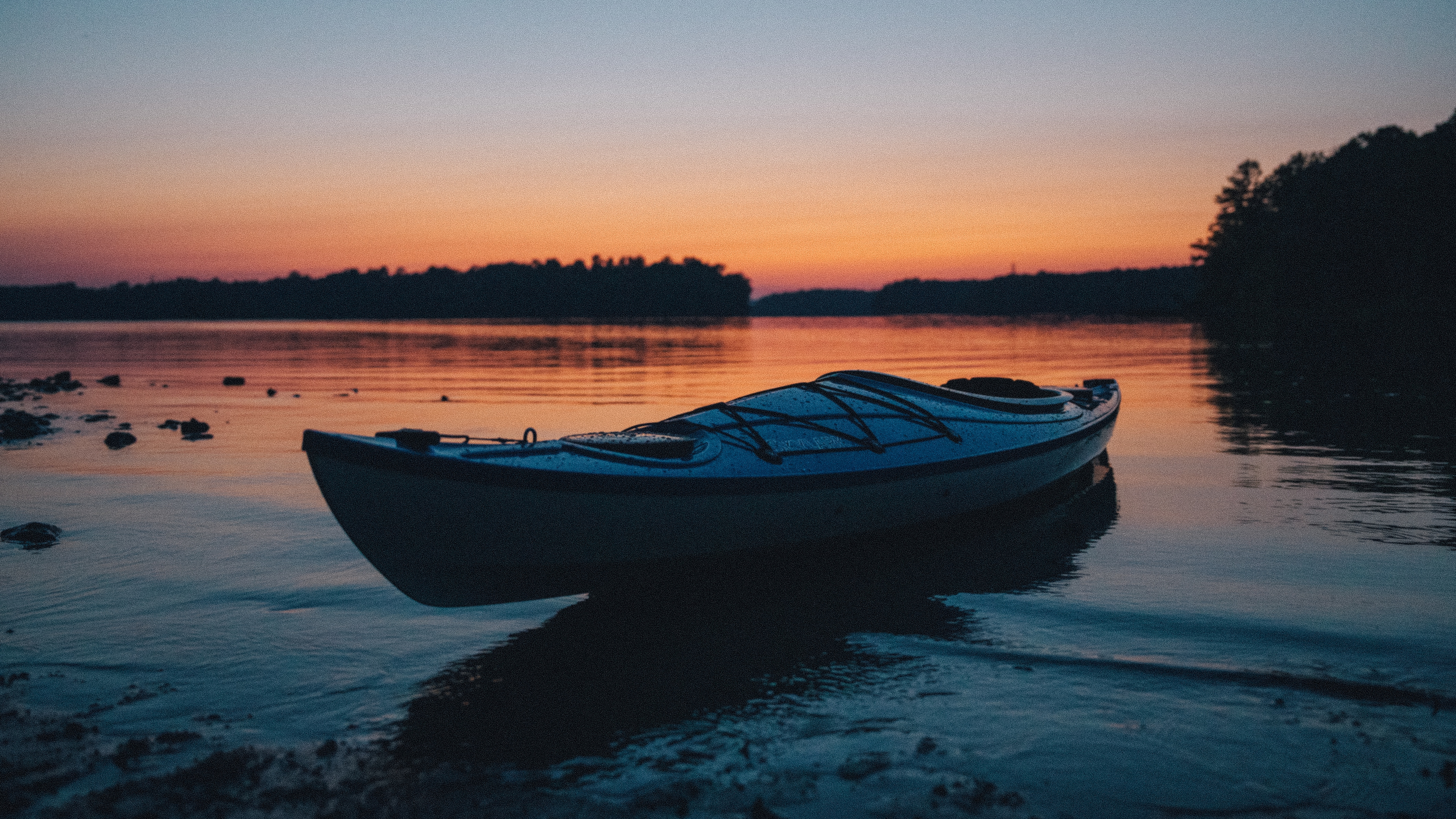 Description: A boat sitting on the shore of a lake at sunset or dawn with a few ducks in the water.