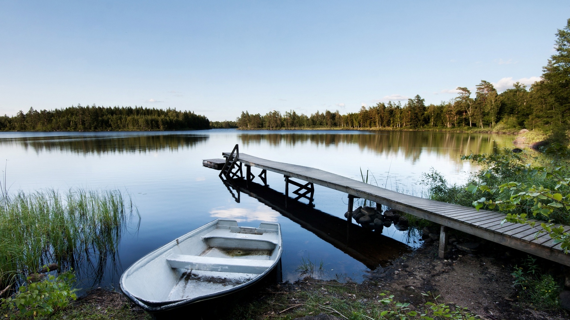 Description: A boat is docked at a pier on a lake with a dock in the background and a boat in the foreground.