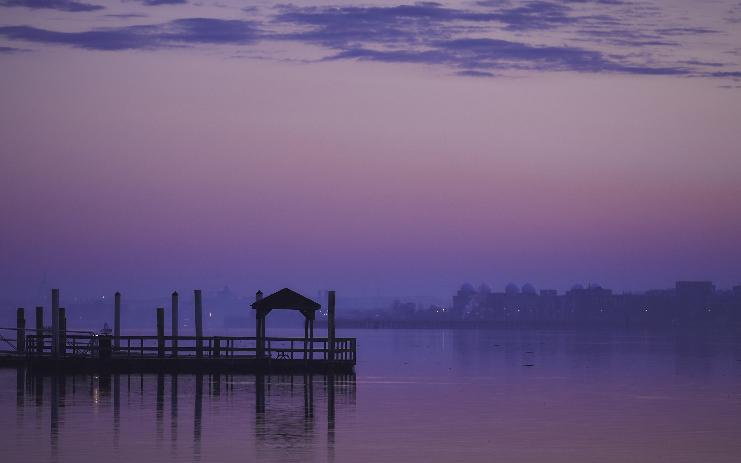 Description: A dock with a gazebo in the middle of a lake at dusk with a city in the background.