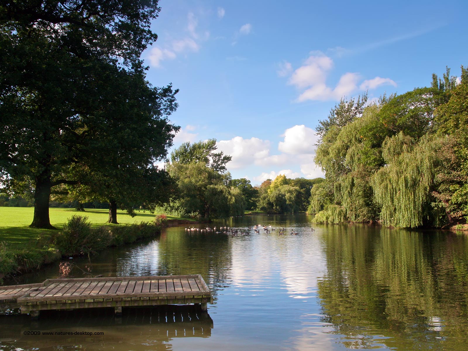 Description: A body of water with a dock in the middle of it and trees around it and a grassy area with a few people on it.