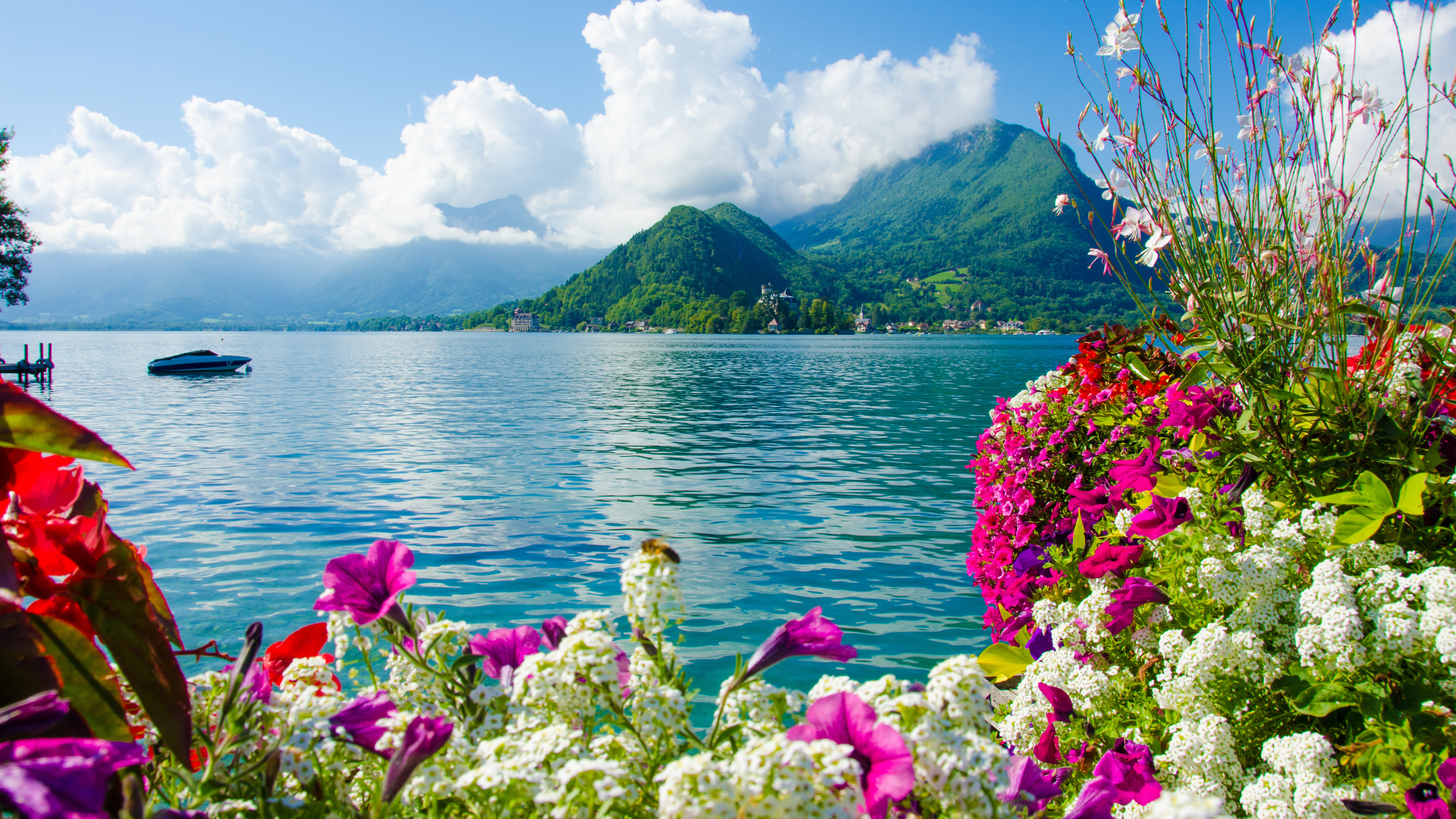 Description: A boat is on a lake surrounded by flowers and trees and mountains in the background with a blue sky.