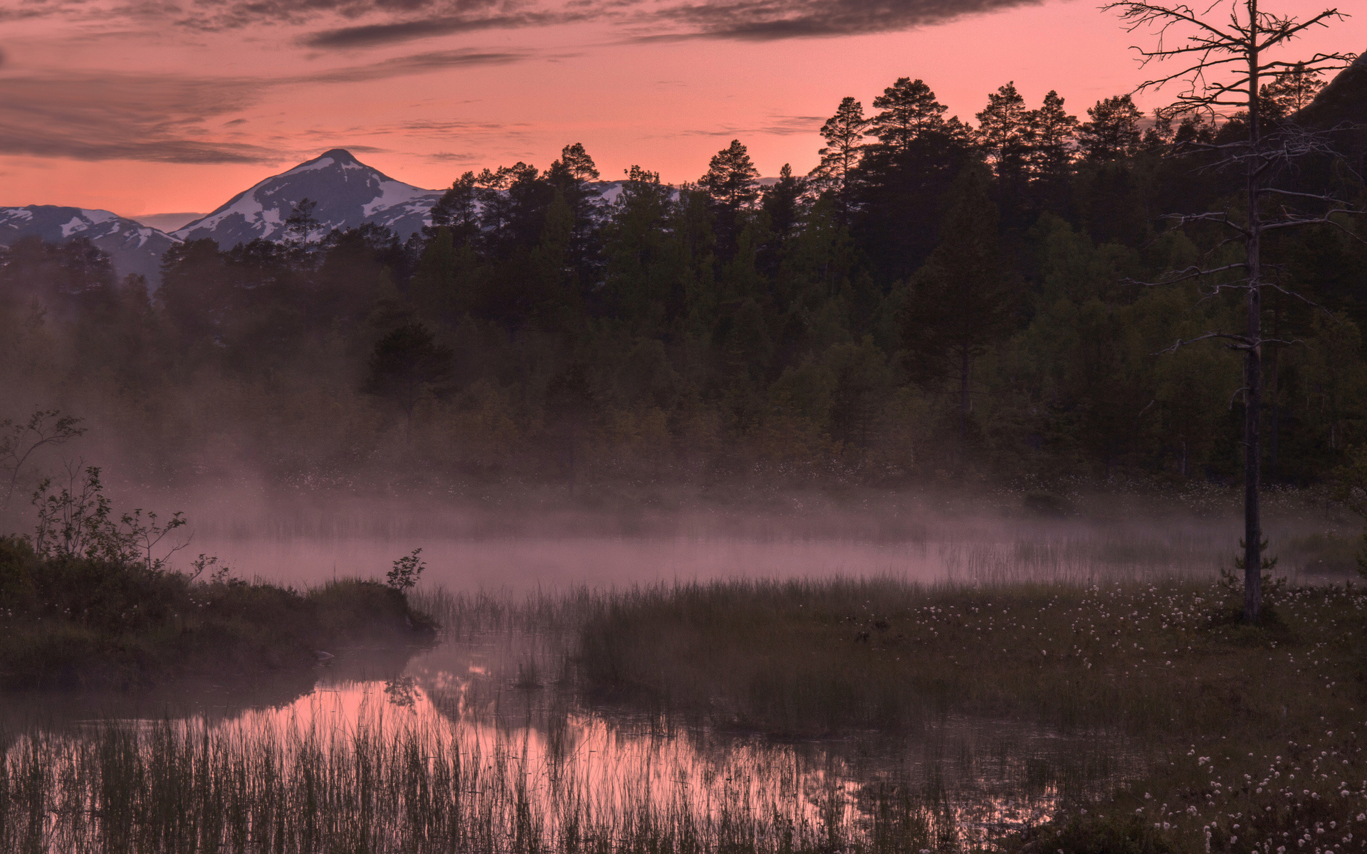 Description: A lake surrounded by trees and fog at sunset with a mountain in the background with a pink sky and clouds.