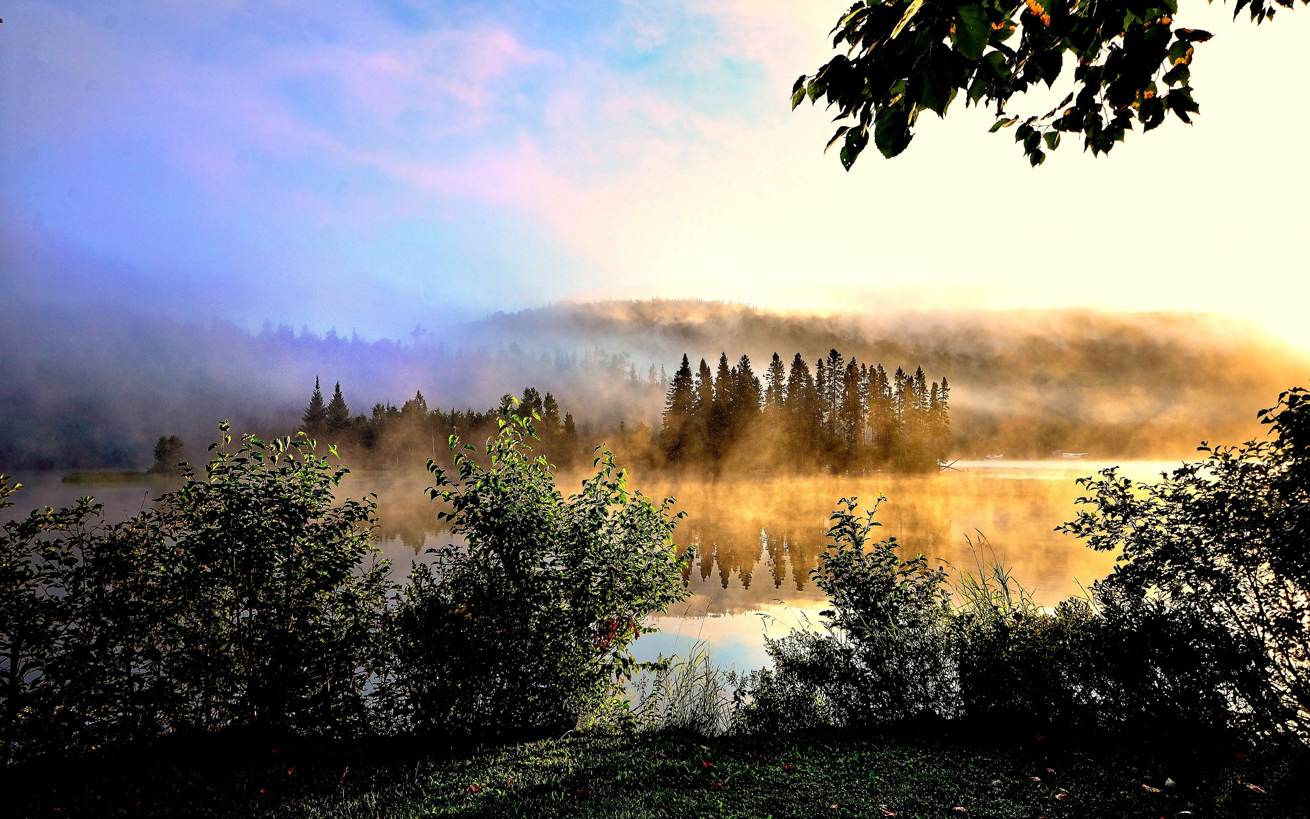 Description: A lake surrounded by trees and fog in the sky with a mountain in the background and a few clouds.