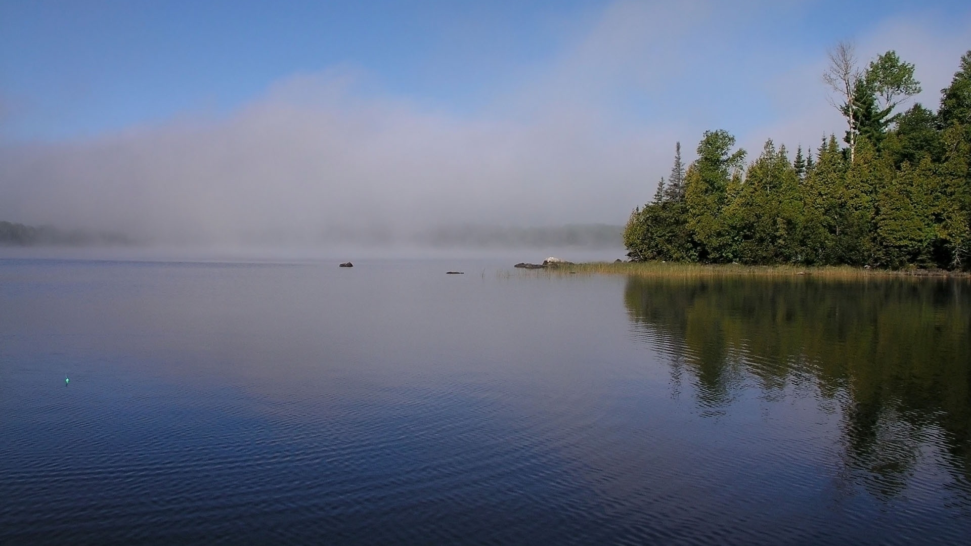 Description: A lake with trees and fog in the background and a few ducks in the water on the lake shore.