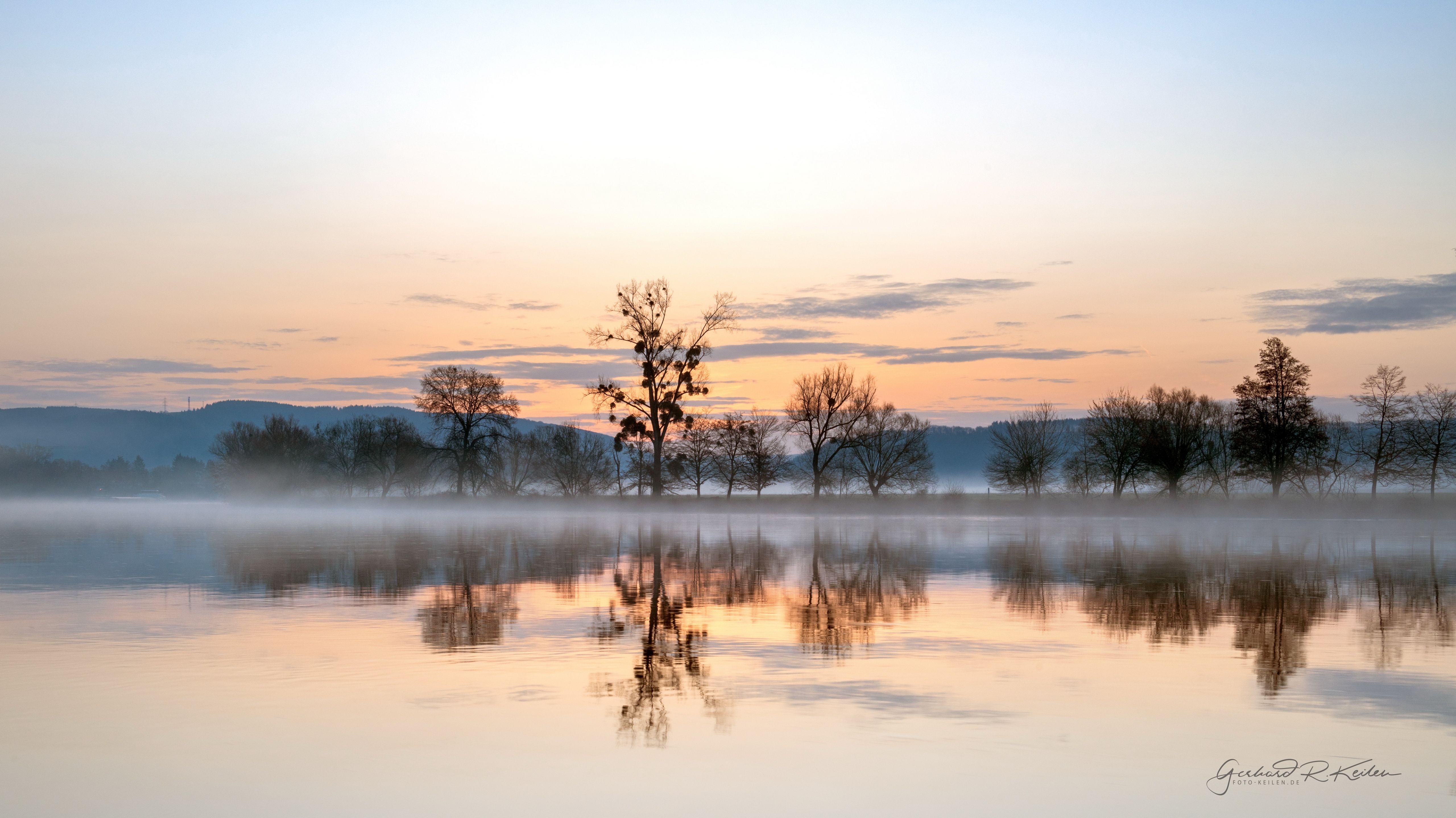 Description: A lake with a few trees in the background and a foggy sky in the foreground with a few clouds.