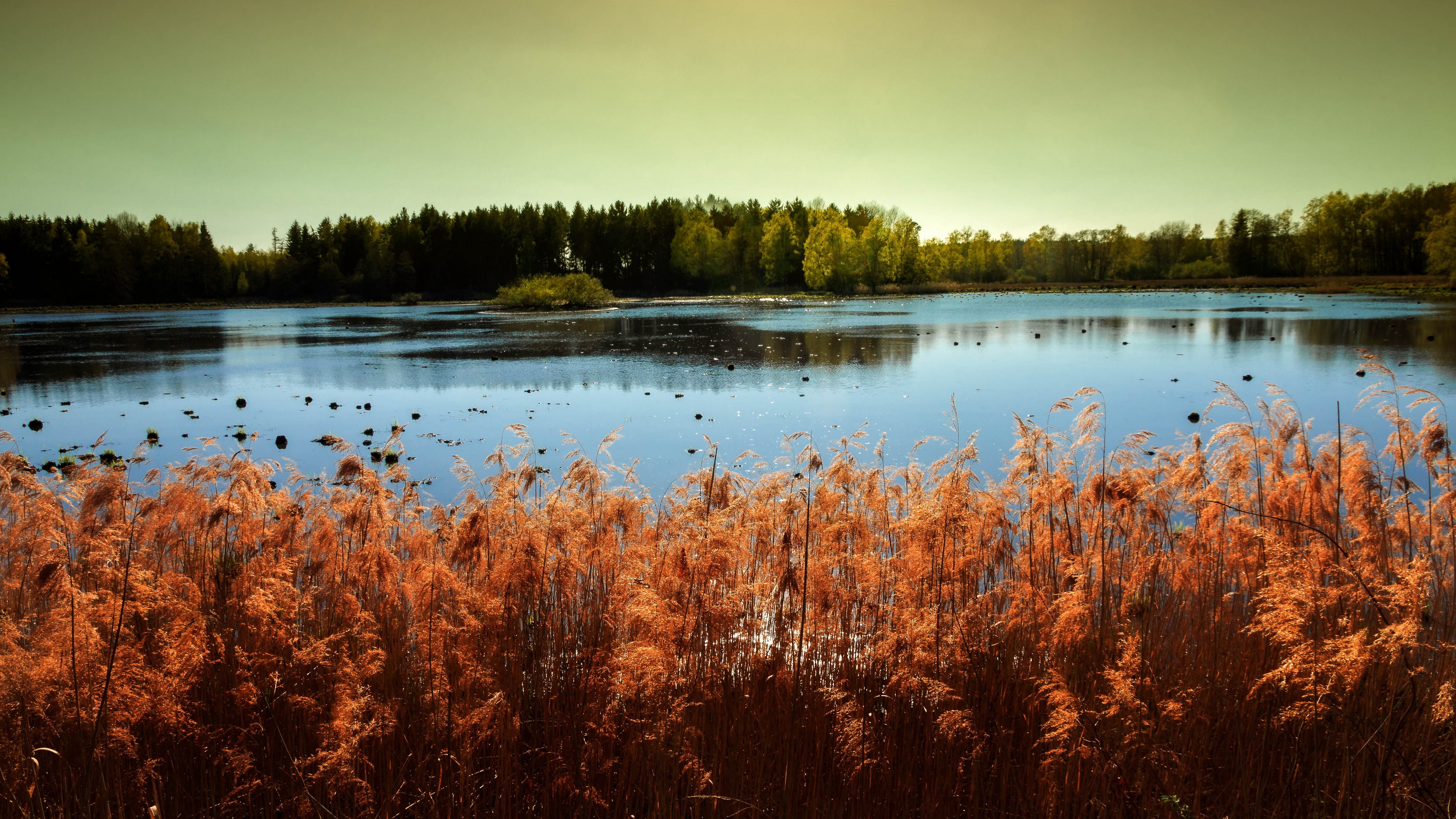 Description: A lake surrounded by tall grass and trees with ducks in the water and ducks in the water in the background.