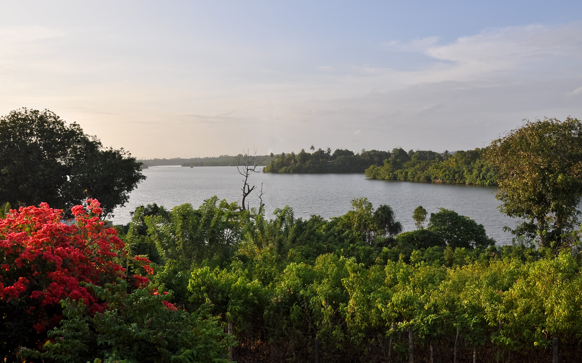 Description: A lake surrounded by trees and bushes with a boat in the distance on the water in the distance is a forest.