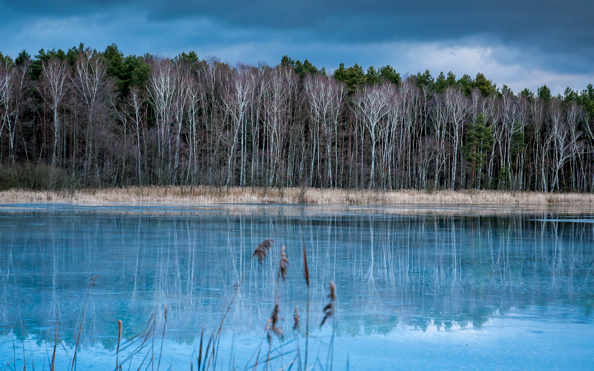 Description: A lake surrounded by trees and grass under a cloudy sky with a few clouds in the sky above it.