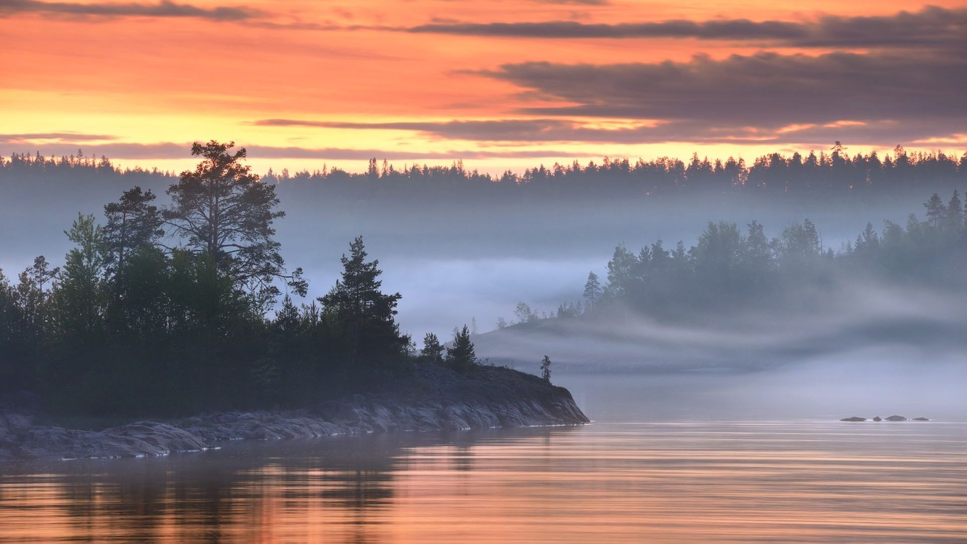 Description: A lake with a forest in the background and fog in the air and a sunset in the distance with a few clouds.