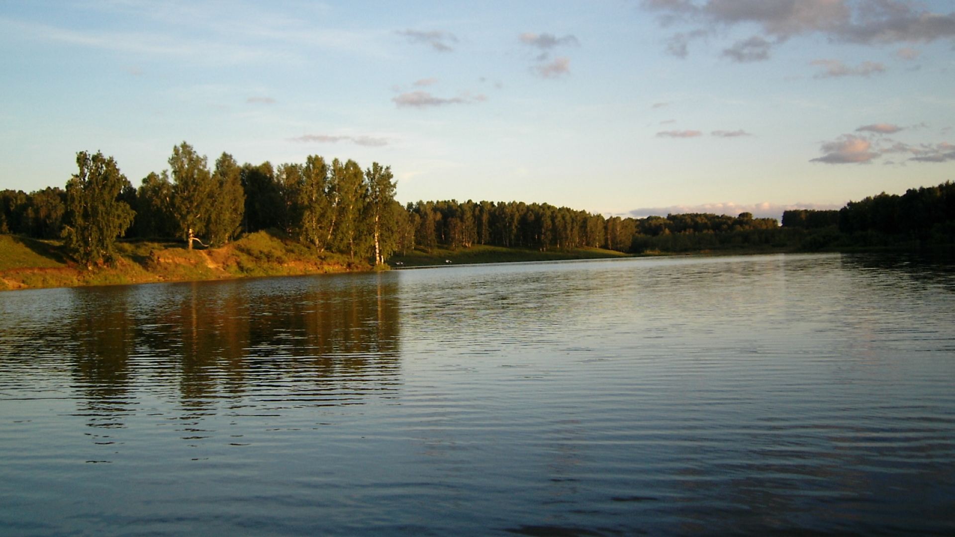 Description: A lake with trees and a sky background with clouds in the background and a few clouds in the sky.
