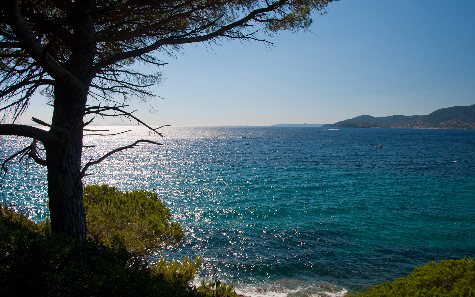 Description: A body of water with a tree in the foreground and a boat in the distance on the water.