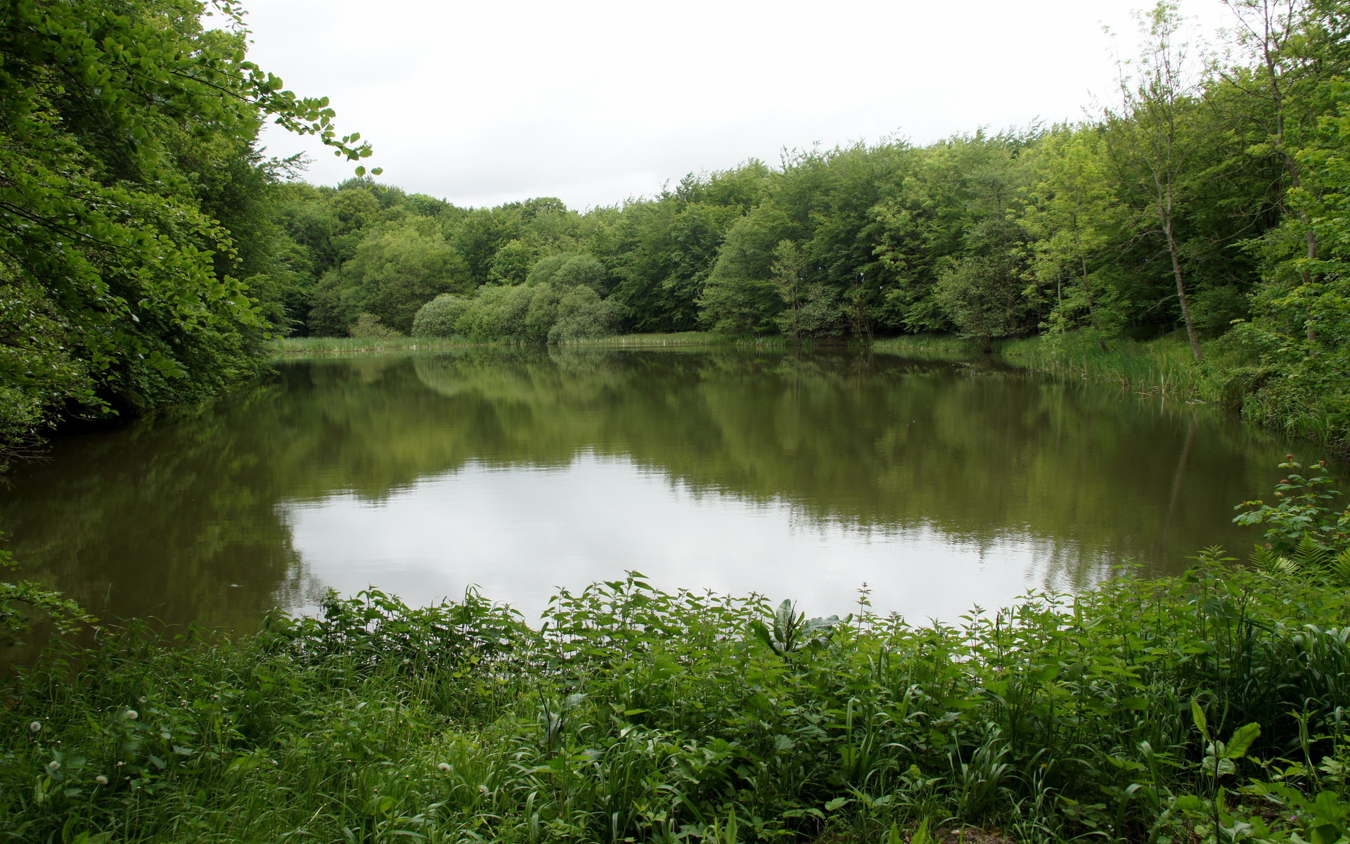 Description: A lake surrounded by trees and bushes in the middle of a forest area with a cloudy sky above it.