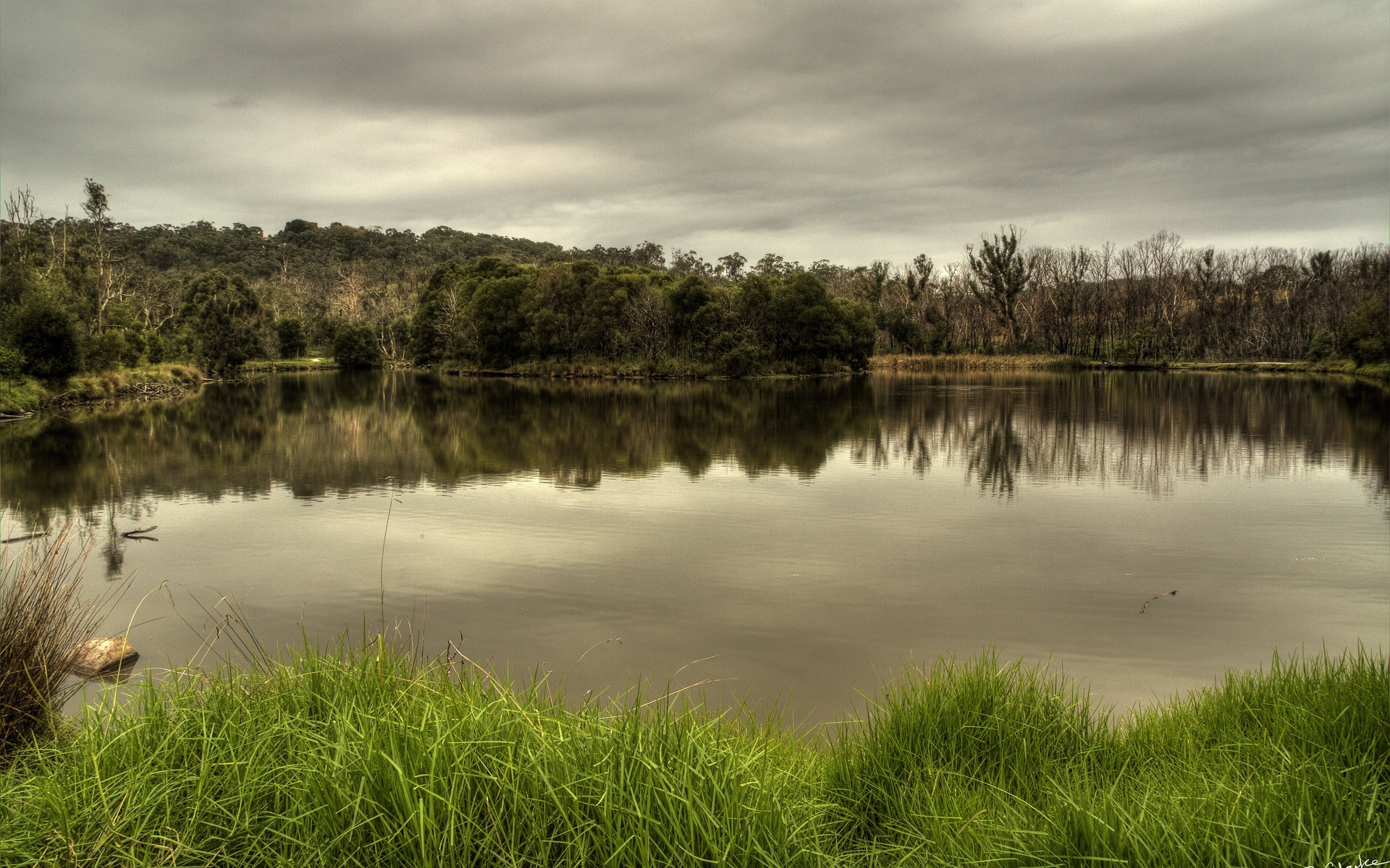 Description: A lake surrounded by lush green grass and trees under a cloudy sky with a few clouds in the sky.
