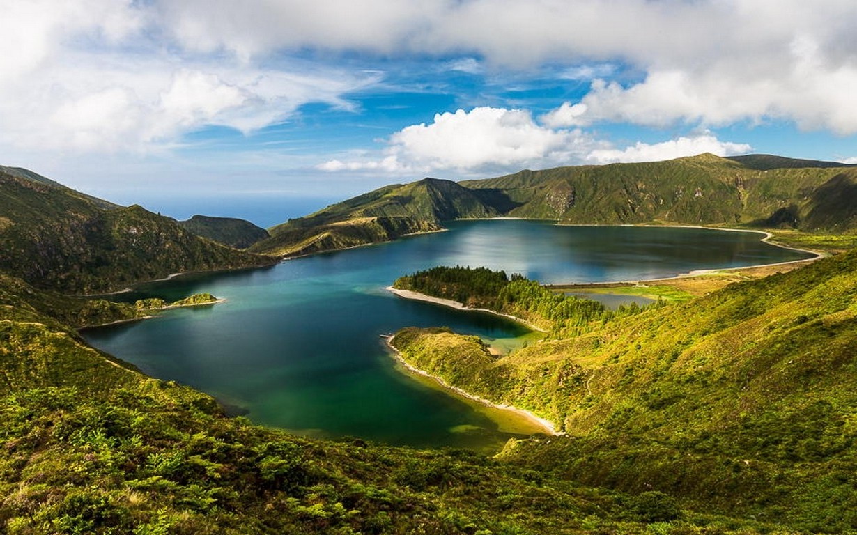 Description: A lake surrounded by lush green hills and a blue sky with clouds above it and a few clouds in the sky.