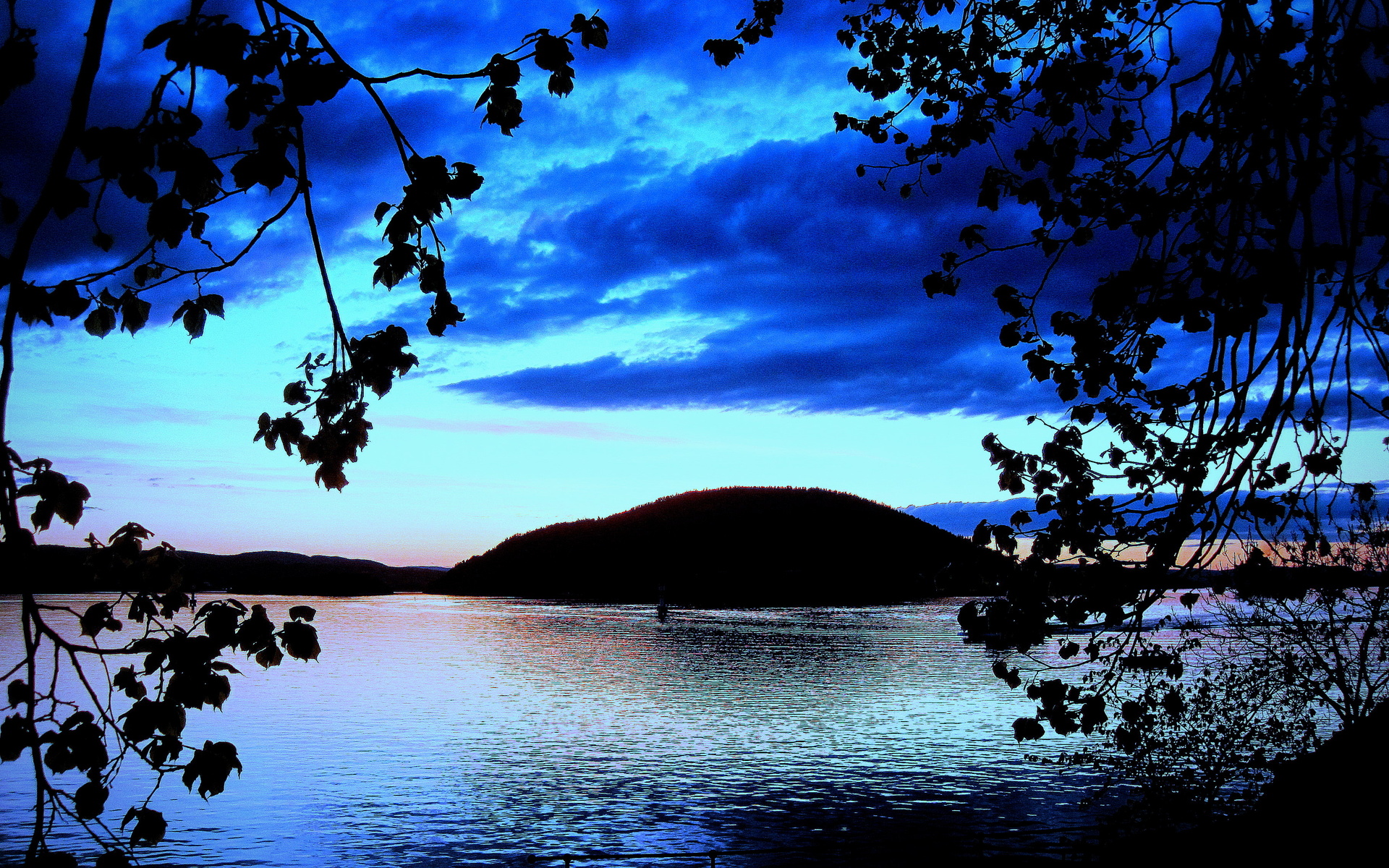 Description: A lake with a hill in the distance and a blue sky above it with clouds and a few trees.