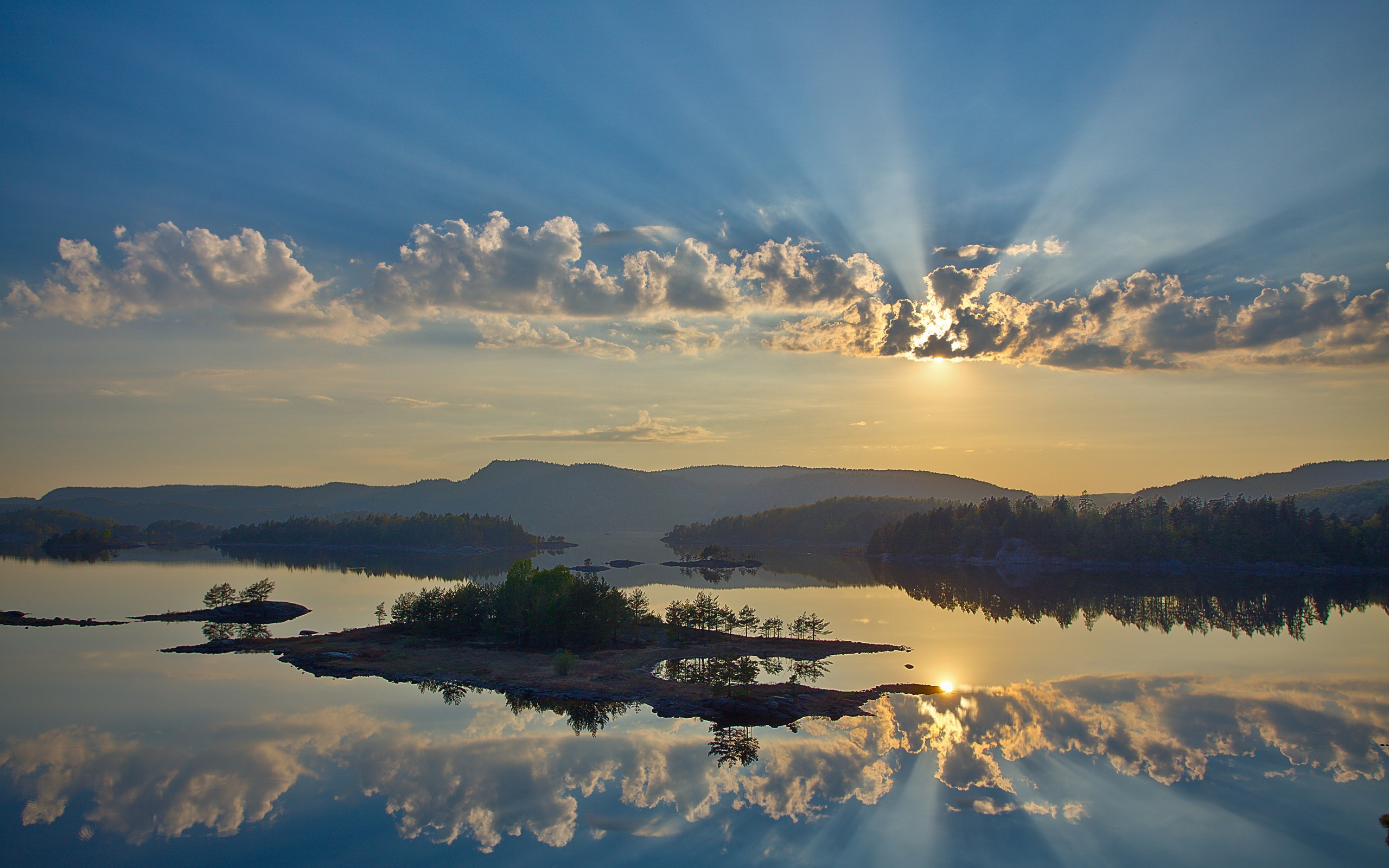 Description: A lake with a small island in the middle of it and a sun shining through the clouds above it.