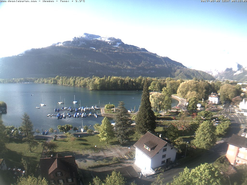 Description: A lake with a mountain in the background and a few boats in the water and a few houses on the shore.