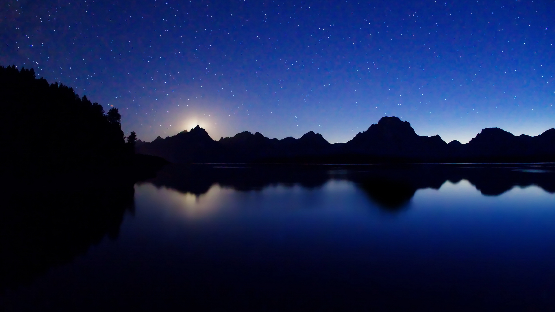 Description: A lake with a mountain range in the background at night with a full moon in the sky above it.