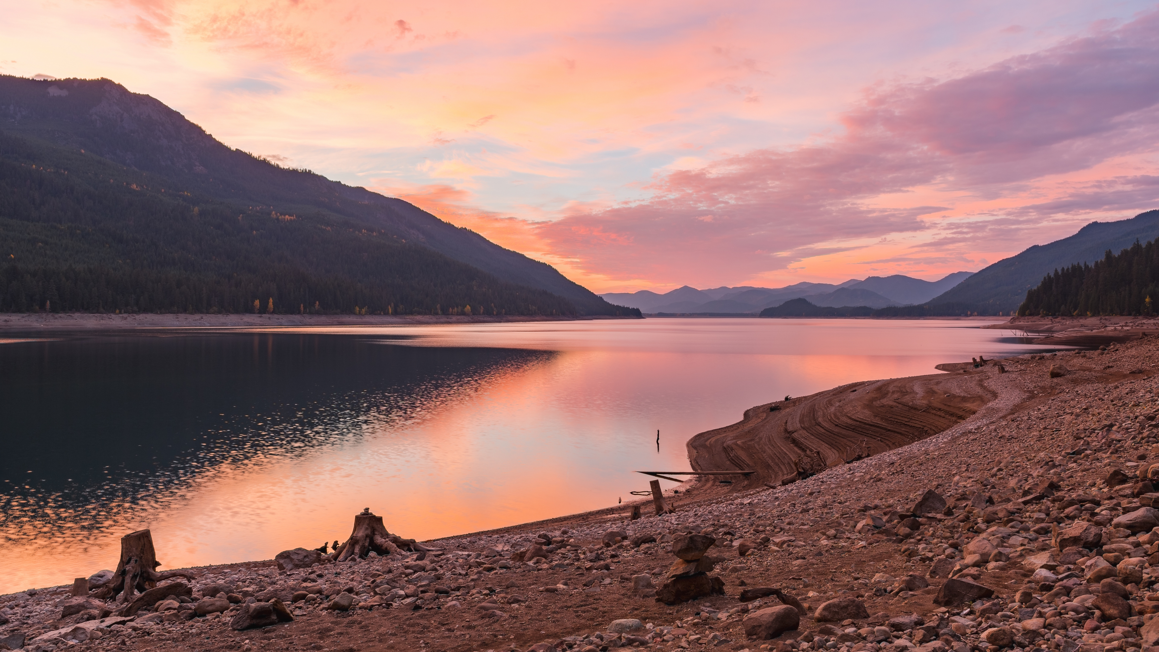 Description: A lake with a mountain in the background and a pink sky in the background with clouds in the sky.