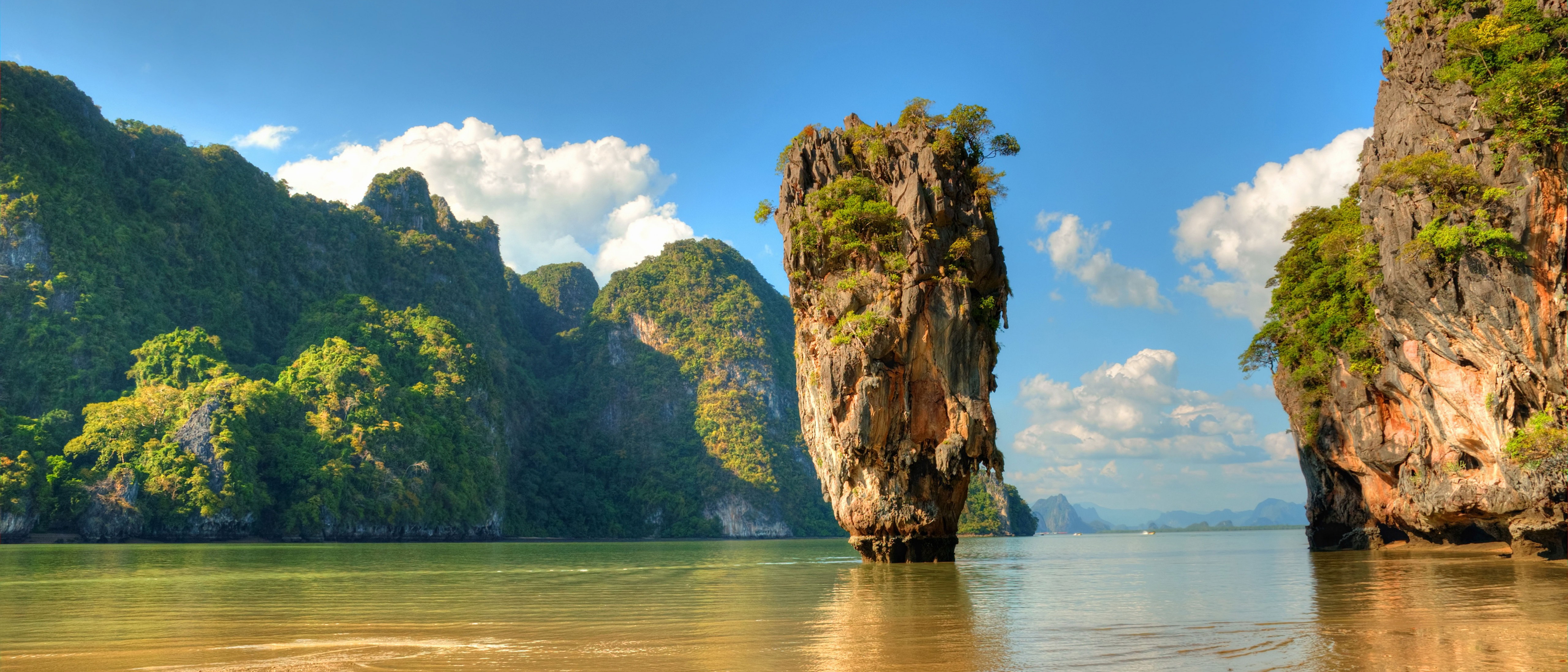 Description: A body of water with two large rocks sticking out of it's sides and a mountain range in the background.